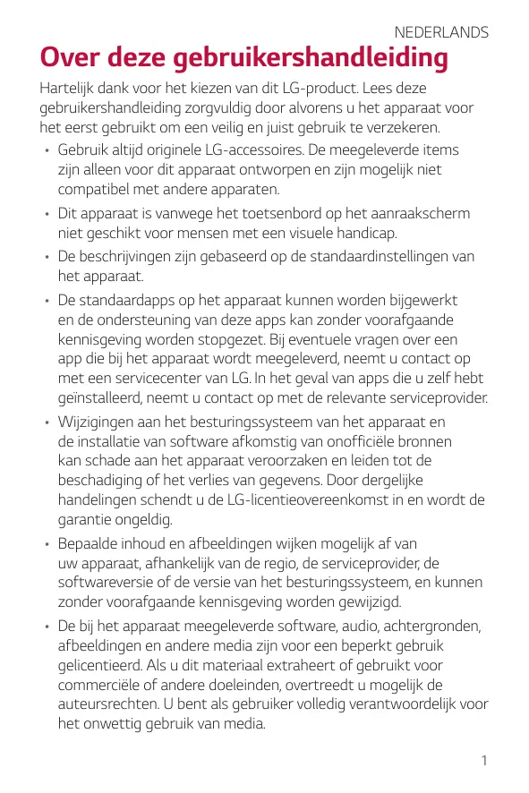 NEDERLANDS Over deze gebruikershandleiding Hartelijk dank voor het kiezen van dit LG-product. Lees deze gebruikershandleiding zorgvuldig door alvorens u het apparaat voor het eerst gebruikt om een veilig en juist gebruik te verzekeren. • Gebruik altijd originele LG-accessoires. De meegeleverde items zijn alleen voor dit apparaat ontworpen en zijn mogelijk niet compatibel met andere apparaten. • Dit apparaat is vanwege het toetsenbord op het aanraakscherm niet geschikt voor mensen met een visuele handicap. • De beschrijvingen zijn gebaseerd op de standaardinstellingen van het apparaat. • De standaardapps op het apparaat kunnen worden bijgewerkt en de ondersteuning van deze apps kan zonder voorafgaande kennisgeving worden stopgezet. Bij eventuele vragen over een app die bij het apparaat wordt meegeleverd, neemt u contact op met een servicecenter van LG. In het geval van apps die u zelf hebt geïnstalleerd, neemt u contact op met de relevante serviceprovider. • Wijzigingen aan het besturingssysteem van het apparaat en de installatie van software afkomstig van onofficiële bronnen kan schade aan het apparaat veroorzaken en leiden tot de beschadiging of het verlies van gegevens. Door dergelijke handelingen schendt u de LG-licentieovereenkomst in en wordt de garantie ongeldig. • Bepaalde inhoud en afbeeldingen wijken mogelijk af van uw apparaat, afhankelijk van de regio, de serviceprovider, de softwareversie of de versie van het besturingssysteem, en kunnen zonder voorafgaande kennisgeving worden gewijzigd. • De bij het apparaat meegeleverde software, audio, achtergronden, afbeeldingen en andere media zijn voor een beperkt gebruik gelicentieerd. Als u dit materiaal extraheert of gebruikt voor commerciële of andere doeleinden, overtreedt u mogelijk de auteursrechten. U bent als gebruiker volledig verantwoordelijk voor het onwettig gebruik van media. 1