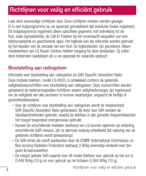 Richtlijnen voor veilig en efficiënt gebruik Lees deze eenvoudige richtlijnen door. Deze richtlijnen moeten worden gevolgd. Er is een hulpprogramma op uw apparaat geïnstalleerd dat eventuele fouten registreert. Dit hulpprogramma registreert alleen specifieke gegevens met betrekking tot de fout, zoals signaalsterkte, de Cell ID Position bij het onverwacht wegvallen van een telefoongesprek en geactiveerde apps. Het logboek kan als referentie worden gebruikt bij het bepalen van de oorzaak van een fout. De logbestanden zijn gecodeerd. Alleen medewerkers van LG Repair Centres hebben toegang tot deze bestanden. Zij zullen deze bestanden raadplegen als u uw apparaat ter reparatie opstuurt.