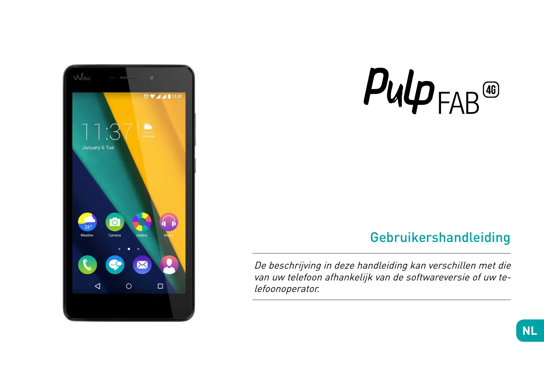- Door de batterij uit het apparaat te halen: op de achterkant zit een etiket met uw IMEI code. (voor niet uitneembare batterijen moet u op het etiket van de telefoonbehuizing kijken). LET OP WIKO geeft geen garantie voor normale slijtage (batterijen, schermen, toetsenborden, cameralenzen enz.). Overeenkomst over het gebruik van gegevens De registratie van uw WIKO telefoon is een gratis service die de technici van WIKO in staat stelt over de materiële gegevens van uw telefoon te beschikken onmiddellijk te weten welk model u heeft en welke materiële specificaties. Andersom kunnen zij u zo op de hoogte houden van beschikbare updates voor uw systeem en u waarschuwen in geval zich een algemeen bekend technisch mankement voordoet met een model of een bepaalde serie. Bovendien maakt deze service het ons mogelijk u onmiddellijk te waarschuwen bij problemen om daar zo snel mogelijk een technische oplossing voor te bieden. De verzameling van deze informatie is nodig om WIKO in staat te stellen de voor uw telefoon bestemde updates te bieden. Met de registratie van uw telefoon, kent u WIKO en zijn technisch personeel het recht toe informatie te kunnen verzamelen, bewaren, analyseren en gebruiken in verband met technische diagnose, gebruik en daarmee samenhangende zaken, daarbij onbeperkt inbegrepen informatie over uw WIKO toestel, uw systeemsoftware en uw applicaties. Wij verzamelen deze informatie regelmatig om het eenvoudiger te maken updates van software en productassistentie te verschaffen en u als klant (zo nodig) diverse diensten te bieden met betrekking tot de software van uw toestel. WIKO kan deze informatie gebruiken, zonder de identiteit van de klant openbaar te maken om zijn producten of diensten aan de gebruiker aan te bieden of te verbeteren. Deze service verschaft ons geen toegang tot uw persoonlijke inhoud en bestanden. Voor de registratie van uw WIKO telefoon is een korte verbinding nodig met het mobiel internet netwerk. Dat kan kosten met zich meebrengen die, afhankelijk van het abonnement bij uw mobiele provider, voor uw rekening zijn. Wij adviseren u een Wifi verbinding te gebruiken. Met Wifi is de gegevensoverdracht onbeperkt (als uw telefoonabonnement slechts beperkte gegevensuitwisseling toestaat) en is de verbinding sneller. De verzamelde informatie wordt met de computer verwerkt om toegang te krijgen tot de materiële gegevens van uw telefoon. Deze zullen voor een periode van maximaal 3 jaar vanaf inzameling, en naar gelang de aard van de gegevens door WIKO in een speciale, beveiligde ruimte opgeslagen worden. Indien u toegang wenst tot uw persoonlijke gegevens, een wijziging ervan wil aanvragen of een verzoek wil indienen om uit ons bestand verwijderd te worden, kan u zich met een schrijven richten tot WIKO SAS, 1, rue Capitaine Dessemond, 13007 MARSEILLE, FRANKRIJK. ~ Recyclage In deze handleiding geeft het symbool van de vuilnisbak met een kruis er doorheen aan dat het product is onderworpen aan de Europese richtlijn 2002/96/EG : elektrische en elektronische producten, batterijen, accu’s en accessoires moeten altijd worden onderworpen aan afvalsortering. Zorg ervoor dat de niet langer gebruikte telefoon wordt gedeponeerd in een passende container of breng hem terug naar een mobiele telefoonzaak. Deze manier van handelen zal bijdragen tot het verminderen van de gevaren voor het milieu en de volksgezondheid. Gemeentehuizen, wederverkopers en nationale fabrikantverenigingen zullen u de nodige informatie geven over het verwijderen van uw oude apparaat. «Details van en voorwaarden voor onze fabrieksgarantie zijn beschikbaar op de website www.wikomobile.com» CONFORMITEITSVERKLARING Wij, WIKO SAS - 1, rue Capitaine Dessemond - 13007 Marseille - FRANKRIJK, verklaren hiermee dat de mobiele telefoon PULP FAB 4G in overeenstemming is met de bepalingen van de richtlijnen en normen. SAFET Y : EN 60950-1: 2006+A11 :2009+A1 :2010+A12 :2011+A 2:2013; EN 503 32-1:2013; EN 503 32-2:2013; EN 62471:2008 EMC : EN 301 4 89-1 V1.9.2; EN 301 4 89-3 V1.6.1; EN 301 4 89-7 V1.3.1; EN 301 4 89-17 V2.2.1; EN 301 4 89 -24 V1.5.1/ SAR : EN 50360:2001+A1:2012; EN 50566:2013; EN 62209-1:2006; EN 62209-2:2010; EN 62479: 2010/ R ADIO : EN 301 511 V9.0.2 (2003-03); EN 300 328 V1.8.1:2012; EN 301 908-1 V6.2.1; EN 301 908-2 V6.2.1; EN 301 908-13 V6.2.1 ; EN 300 4 40-1 V1.6.1; EN 300 4 40-2 V1.4.1 De procedure voor de conformiteitsverklaring, heeft als omschreven in artikel 10, lid 5 van Richtlijn 1999/5/EG, plaatsgevonden onder controle van de volgende instantie : PHOENIX TESTLAB GmbH, Königswinkel 10 D-32825 Blomberg, Duitsland www.phoenix-testlab.de Telefoon + 49 (0) 5235-9500-0 / Fax +49(0)5235-9500-10 De volledige tekst van de conformiteitsverklaring van het apparaat is verkrijgbaar op schriftelijke aanvraag aan het volgende adres : WIKO SAS - 1, rue Capitaine Dessemond - 13007 Marseille - FRANKRIJK 13/10/2015 (Datum) Michel ASSADOURIAN / CEO (Naam en handtekening van de naar behoren gemachtigde manager) WIKO SAS 1, rue Capitaine Dessemond 13007 Marseille FRANKRIJK www.wikomobile.com Als men langere tijd met het volle geluidsvolume naar de muziekspeler luistert, kan dit het gehoor van de luisteraar beschadigen. دليل االستعمال قد يحتوي الوصف الذي يتضمنه هذا الكتيب على بعض االختالفات بينه .وبين هاتفك؛ وذلك تبعا ً لنسخة البرمجية أو شركة الجوال الخاصة بك