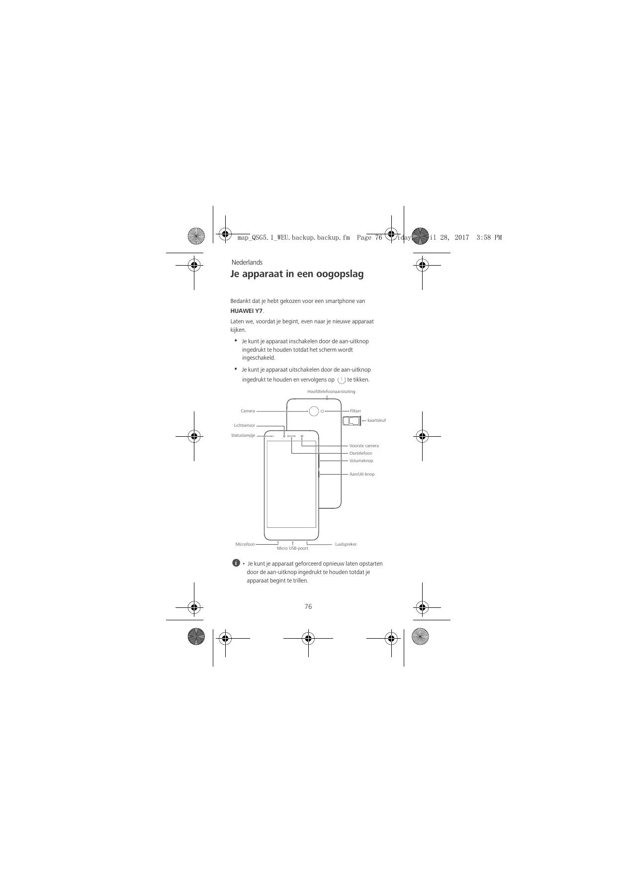 Nederlands Je apparaat in een oogopslag Bedankt dat je hebt gekozen voor een smartphone van HUAWEI Y7. Laten we, voordat je begint, even naar je nieuwe apparaat kijken.