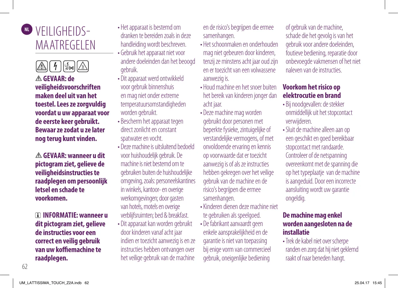MANTENIMIENTO COTIDIANO/CUIDADOS DIÁRIOS���������������������������������������������� 105 LAVADO A MANO DEL RAPID CAPPUCCINO SYSTEM (R.C.S.)/ CUESTIONES ECOLÓGICAS Y DE ELIMINACIÓN DE RESIDUOS/ ELIMINAÇÃO E PREOCUPAÇÕES ECOLÓGICAS �������������������������������������������������� 115 PÓNGASE EN CONTACTO CON EL CLUB NESPRESSO/CONTACTE O CLUBE NESPRESSO��������������������������������������������������������������������������������������������������� 115 Asegúrese de que la tensión de la fuente de energía sea la misma que la que se indica en la placa de señalización. El uso de una conexión incorrecta anula la garantía. El aparato solo debe conectarse después de la instalación • N o tire del cable de alimentación encima de bordes afilados; recójalo o déjelo colgar. • G uarde el cable de alimentación lejos del calor y la humedad. • S i el cable de alimentación 25.04.17 15:45 Pasta «Bem-vindo à Nespresso»