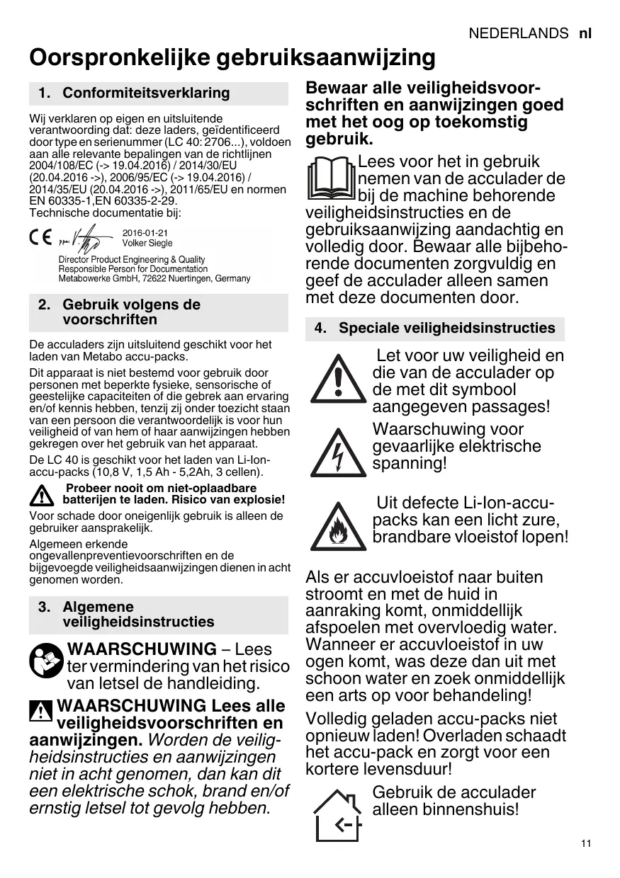 Le LC 40 convient pour charger des blocs batteries Li-Ion (10,8 V, 1,5 Ah - 5,2Ah, 3 éléments). Ne jamais essayer de charger des piles non rechargeables. Danger d'explosion ! L'utilisateur sera entièrement responsable de tous dommages résultant d'une utilisation non conforme à la destination de la machine. Il est impératif de respecter les consignes générales de protection contre les accidents ainsi que les consignes de sécurité ci-jointes.