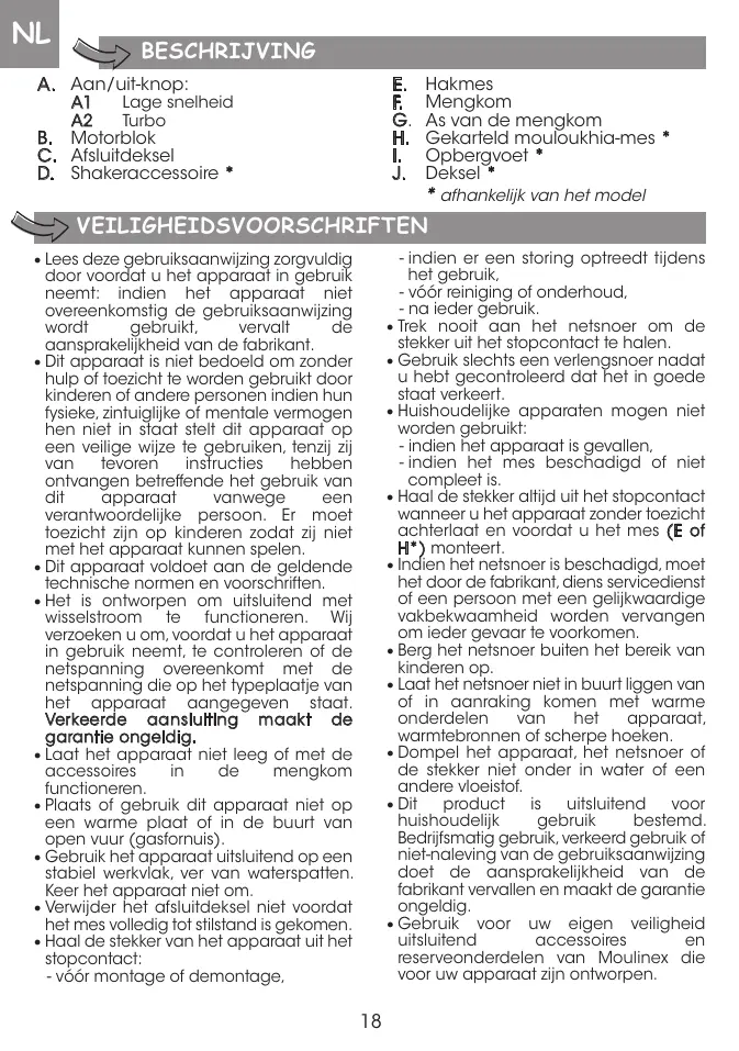 VEILIGHEIDSVOORSCHRIFTEN - indien er een storing optreedt tijdens het gebruik, - vóór reiniging of onderhoud, - na ieder gebruik. • Trek nooit aan het netsnoer om de stekker uit het stopcontact te halen. • Gebruik slechts een verlengsnoer nadat u hebt gecontroleerd dat het in goede staat verkeert. • Huishoudelijke apparaten mogen niet worden gebruikt: - indien het apparaat is gevallen, - indien het mes beschadigd of niet compleet is. • Haal de stekker altijd uit het stopcontact wanneer u het apparaat zonder toezicht achterlaat en voordat u het mes (E of H*) monteert. • Indien het netsnoer is beschadigd, moet het door de fabrikant, diens servicedienst of een persoon met een gelijkwaardige vakbekwaamheid worden vervangen om ieder gevaar te voorkomen. • Berg het netsnoer buiten het bereik van kinderen op. • Laat het netsnoer niet in buurt liggen van of in aanraking komen met warme onderdelen van het apparaat, warmtebronnen of scherpe hoeken. • Dompel het apparaat, het netsnoer of de stekker niet onder in water of een andere vloeistof. • Dit product is uitsluitend voor huishoudelijk gebruik bestemd. Bedrijfsmatig gebruik, verkeerd gebruik of niet-naleving van de gebruiksaanwijzing doet de aansprakelijkheid van de fabrikant vervallen en maakt de garantie ongeldig. • Gebruik voor uw eigen veiligheid uitsluitend accessoires en reserveonderdelen van Moulinex die voor uw apparaat zijn ontworpen.