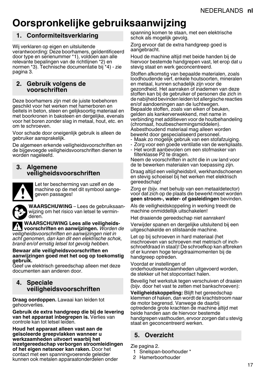 2. Utilisation conforme à la destination Equipé des accessoires correspondants, ces perceuses à percussion sont prévues pour travailler avec des forets marteau et des burins dans le béton, la pierre ou des matériaux similaires, et avec des trépans dans les tuiles, etc., ainsi que pour percer sans percussion dans le métal, le bois, etc. ou pour serrer des vis. L'utilisateur sera entièrement responsable de tous dommages résultant d'une utilisation non conforme à la destination de l'appareil. Il est impératif de respecter les consignes générales de protection contre les accidents ainsi que les consignes de sécurité ci-jointes.