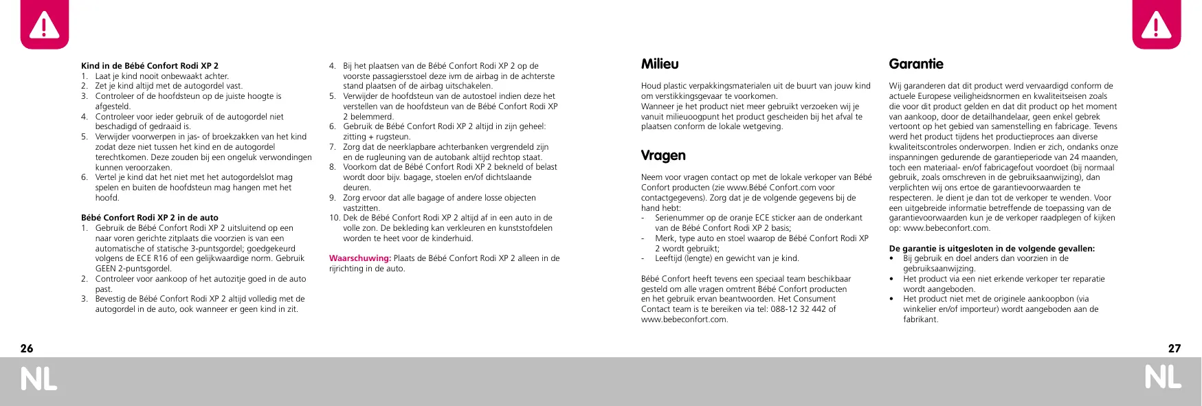 était exempt de tout défaut de composition et de fabrication. Pendant son processus de production, ce produit a également été soumis à divers contrôles de qualité. Si, malgré tous nos efforts, un défaut de matériau et/ou un vice de fabrication venait à survenir pendant la période de garantie de 24 mois (dans le cas d’une utilisation normale, telle que décrite dans le mode d’emploi), nous nous engageons à respecter les conditions de garantie. Vous êtes alors prié de vous adresser à votre vendeur. Pour des informations plus détaillées concernant l’applicabilité des conditions de garantie, veuillez prendre contact avec votre vendeur ou regarder sur : www.bebeconfort.com.