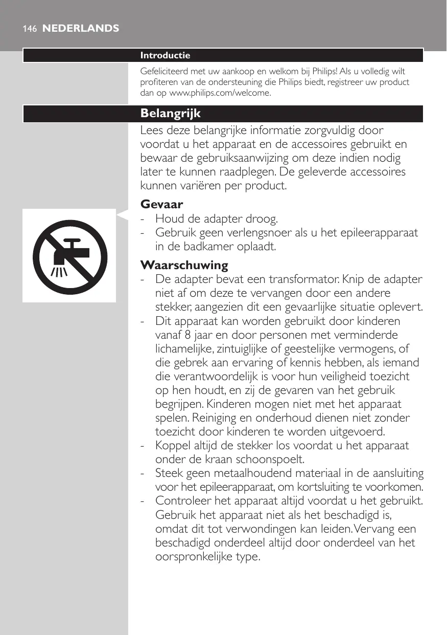 ITALIANO Rimozione della batteria usa e getta Per rimuovere le batterie usa e getta, consultate la relativa sezione nel manuale dell’utente. Garanzia e assistenza Per assistenza o informazioni, visitate il sito Web all’indirizzo www.philips.com/ support oppure leggete l’opuscolo della garanzia internazionale. Limitazioni della garanzia I blocchi lame non sono coperti dai termini della garanzia internazionale perché soggetti a usura. Risoluzione dei problemi In questo capitolo vengono riportati i problemi più ricorrenti legati all’uso dell’apparecchio. Se non riuscite a risolvere i problemi con le informazioni seguenti, contattate il Centro Assistenza Clienti Philips del vostro paese. Problema Possibile causa Soluzione L’epilatore non funziona. La presa utilizzata per caricare l’epilatore non funziona. Assicuratevi che la presa utilizzata per caricare l’epilatore funzioni. La spia di ricarica si accende per indicare che il depilatore è in carica. Se collegate l’epilatore a una presa di un armadietto da bagno, potrebbe essere necessario accendere la luce del bagno per verificare che la presa funzioni. Le batterie ricaricabili sono scariche. Quando la spia di ricarica emette una luce rossa fissa le batterie sono scariche e l’epilatore deve essere ricaricato per circa 1 ora. Nota: effettuate una ricarica completa prima di utilizzare l’apparecchio per la prima volta. Il blocco da viaggio Per disattivare il blocco da viaggio, tenete premuto il pulsante è attivo. on/off per 3 secondi fino a che le spie di velocità non lampeggiano in bianco per 2 volte. Potete anche collegare l’epilatore alla rete con l’adattatore per disattivare il blocco da viaggio. La protezione dal Durante l’uso surriscaldamento è l’epilatore si stata attivata. surriscalda e all’improvviso si ferma. Successivamente le spie della velocità e di ricarica lampeggiano in rosso per 30 secondi. L’epilatore è dotato di un sistema integrato di protezione da surriscaldamento, che fa sì che l’epilatore non diventi troppo caldo. Se si attiva questa protezione, l’apparecchio si spegne automaticamente. Le spie della velocità e la spia di ricarica, successivamente, lampeggiano in rosso per 30 secondi. Per reimpostare la protezione, lasciate raffreddare l’epilatore, quindi riaccendetelo. Per evitare il surriscaldamento dell’epilatore, non premetelo con troppa forza sulla pelle. ITALIANO 145 Problema Possibile causa Soluzione La protezione dal Durante l’uso surriscaldamento è l’epilatore stata attivata. all’improvviso si ferma. Successivamente le spie della velocità lampeggiano in rosso per 5 secondi. Se la testina epilatoria viene premuta con troppa forza sulla pelle o quando i dischi rotanti della testina si bloccano (ad esempio a causa di un pezzo di tessuto che rimane bloccato tra i dischi epilatori), l’epilatore si spegne automaticamente. Le spie della velocità, successivamente, lampeggiano in rosso per 5 secondi. Girate i dischi epilatori con il pollice fino a che non si rimuove la causa del blocco. Successivamente riaccendete l’epilatore. Dopo la rasatura o Muovete il rasoio la rifinitura la pelle (con o senza il è irritata. pettine regola altezza) nella direzione sbagliata o premete con troppa forza. La pelle si può irritare leggermente o possono comparire dei puntini rossi. Ciò è normale. Per evitare l’irritazione della pelle, assicuratevi che la testina di rasatura (con o senza pettina regola altezza) sia sempre completamente a contatto con la pelle; inoltre, muovete sempre con delicatezza l’apparecchio contropelo. Non premete con troppa forza durante la rasatura o la rifinitura per evitare irritazioni cutanee. Verificate se la testina di rasatura o il pettine regola altezza sono danneggiati. Sostituite sempre le parti danneggiate o rotte con parti originali Philips. L’epilatore di precisione non funziona. Le batterie usa e getta sono scariche o non sono state inserite correttamente. Sostituite le batterie e inseritele correttamente (consultate il capitolo “Utilizzo del mini epilatore”). Le prestazioni dell’epilatore di precisione sono scarse. Dopo 40 minuti le batterie usa e getta sono quasi scariche e non dispongono di alimentazione sufficiente per garantire delle buone prestazioni. Inserite delle batterie nuove (consultate il capitolo “Utilizzo del mini epilatore”). Utilizzate solo batterie alcaline AA non ricaricabili da 1,5 V. 146 NEDERLANDS Introductie Gefeliciteerd met uw aankoop en welkom bij Philips! Als u volledig wilt profiteren van de ondersteuning die Philips biedt, registreer uw product dan op www.philips.com/welcome. Belangrijk Lees deze belangrijke informatie zorgvuldig door voordat u het apparaat en de accessoires gebruikt en bewaar de gebruiksaanwijzing om deze indien nodig later te kunnen raadplegen. De geleverde accessoires kunnen variëren per product. Gevaar -- Houd de adapter droog. -- Gebruik geen verlengsnoer als u het epileerapparaat in de badkamer oplaadt. Waarschuwing -- De adapter bevat een transformator. Knip de adapter niet af om deze te vervangen door een andere stekker, aangezien dit een gevaarlijke situatie oplevert. -- Dit apparaat kan worden gebruikt door kinderen vanaf 8 jaar en door personen met verminderde lichamelijke, zintuiglijke of geestelijke vermogens, of die gebrek aan ervaring of kennis hebben, als iemand die verantwoordelijk is voor hun veiligheid toezicht op hen houdt, en zij de gevaren van het gebruik begrijpen. Kinderen mogen niet met het apparaat spelen. Reiniging en onderhoud dienen niet zonder toezicht door kinderen te worden uitgevoerd. -- Koppel altijd de stekker los voordat u het apparaat onder de kraan schoonspoelt. -- Steek geen metaalhoudend materiaal in de aansluiting voor het epileerapparaat, om kortsluiting te voorkomen. -- Controleer het apparaat altijd voordat u het gebruikt. Gebruik het apparaat niet als het beschadigd is, omdat dit tot verwondingen kan leiden. Vervang een beschadigd