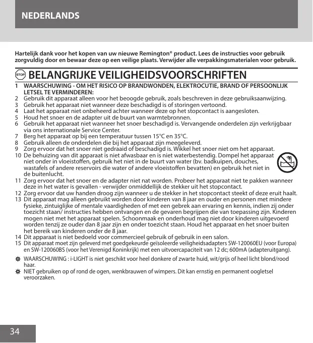 1 WAARSCHUWING - OM HET RISICO OP BRANDWONDEN, ELEKTROCUTIE, BRAND OF PERSOONLIJK LETSEL TE VERMINDEREN: 2 Gebruik dit apparaat alleen voor het beoogde gebruik, zoals beschreven in deze gebruiksaanwijzing. 3 Gebruik het apparaat niet wanneer deze beschadigd is of storingen vertoond. 4 Laat het apparaat niet onbeheerd achter wanneer deze op het stopcontact is aangesloten. 5 Houd het snoer en de adapter uit de buurt van warmtebronnen. 6 Gebruik het apparaat niet wanneer het snoer beschadigd is. Vervangende onderdelen zijn verkrijgbaar via ons internationale Service Center. 7 Berg het apparaat op bij een temperatuur tussen 15°C en 35°C. 8 Gebruik alleen de onderdelen die bij het apparaat zijn meegeleverd. 9 Zorg ervoor dat het snoer niet gedraaid of beschadigd is. Wikkel het snoer niet om het apparaat. 10 De behuizing van dit apparaat is niet afwasbaar en is niet waterbestendig. Dompel het apparaat niet onder in vloeistoffen, gebruik het niet in de buurt van water (bv. badkuipen, douches, wastafels of andere reservoirs die water of andere vloeistoffen bevatten) en gebruik het niet in de buitenlucht. 11 Zorg ervoor dat het snoer en de adapter niet nat worden. Probeer het apparaat niet te pakken wanneer deze in het water is gevallen - verwijder onmiddellijk de stekker uit het stopcontact. 12 Zorg ervoor dat uw handen droog zijn wanneer u de stekker in het stopcontact steekt of deze eruit haalt. 13 Dit apparaat mag alleen gebruikt worden door kinderen van 8 jaar en ouder en personen met mindere fysieke, zintuiglijke of mentale vaardigheden of met een gebrek aan ervaring en kennis, indien zij onder toezicht staan/ instructies hebben ontvangen en de gevaren begrijpen die van toepassing zijn. Kinderen mogen niet met het apparaat spelen. Schoonmaak en onderhoud mag niet door kinderen uitgevoerd worden tenzij ze ouder dan 8 jaar zijn en onder toezicht staan. Houd het apparaat en het snoer buiten het bereik van kinderen onder de 8 jaar. 14 Dit apparaat is niet bedoeld voor commercieel gebruik of gebruik in een salon. 15 Dit apparaat moet zijn geleverd met goedgekeurde geïsoleerde veiligheidsadapters SW-120060EU (voor Europa) en SW-120060BS (voor het Verenigd Koninkrijk) met een uitvoercapaciteit van 12 dc; 600mA (adapteruitgang). , WAARSCHUWING : i-LIGHT is niet geschikt voor heel donkere of zwarte huid, wit/grijs of heel licht blond/rood haar. , NIET gebruiken op of rond de ogen, wenkbrauwen of wimpers. Dit kan ernstig en permanent oogletsel veroorzaken.