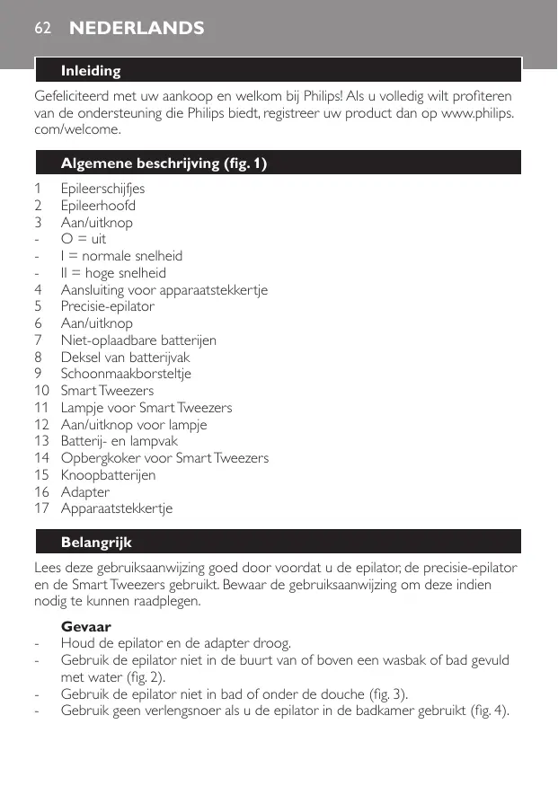 Epileerschijfjes Epileerhoofd Aan/uitknop O = uit I = normale snelheid II = hoge snelheid Aansluiting voor apparaatstekkertje Precisie-epilator Aan/uitknop Niet-oplaadbare batterijen Deksel van batterijvak Schoonmaakborsteltje Smart Tweezers Lampje voor Smart Tweezers Aan/uitknop voor lampje Batterij- en lampvak Opbergkoker voor Smart Tweezers Knoopbatterijen Adapter Apparaatstekkertje Belangrijk Lees deze gebruiksaanwijzing goed door voordat u de epilator, de precisie-epilator en de Smart Tweezers gebruikt. Bewaar de gebruiksaanwijzing om deze indien nodig te kunnen raadplegen.
