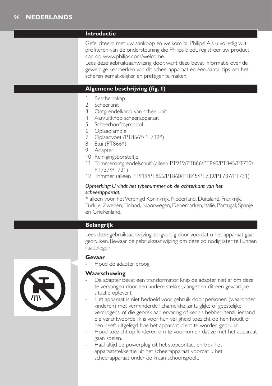 - Dit Philips-apparaat voldoet aan alle richtlijnen en voorschriften met betrekking tot blootstelling aan elektromagnetische velden en kan veilig onder de kraan worden schoongemaakt.