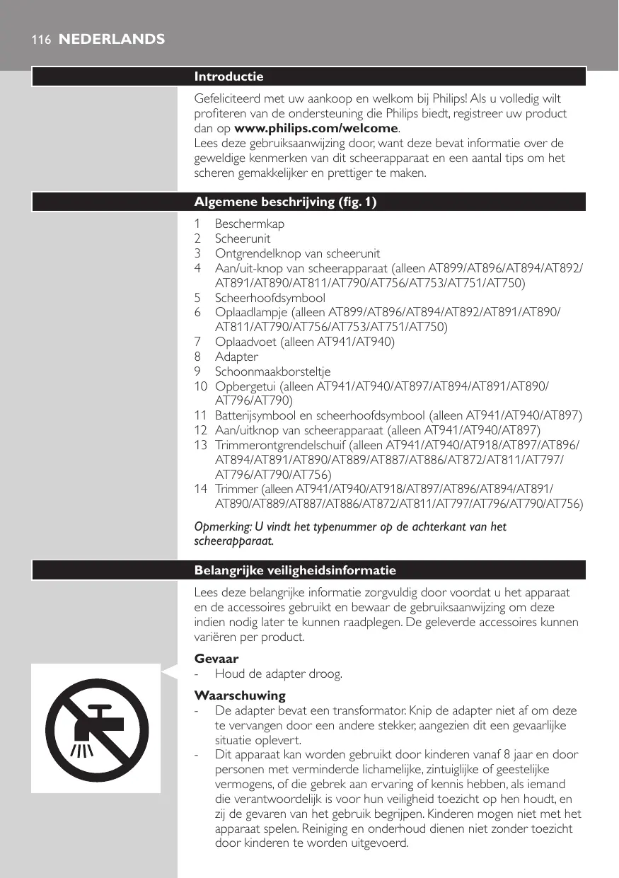 Beschermkap Scheerunit Ontgrendelknop van scheerunit Aan/uit-knop van scheerapparaat (alleen AT899/AT896/AT894/AT892/ AT891/AT890/AT811/AT790/AT756/AT753/AT751/AT750) Scheerhoofdsymbool Oplaadlampje (alleen AT899/AT896/AT894/AT892/AT891/AT890/ AT811/AT790/AT756/AT753/AT751/AT750) Oplaadvoet (alleen AT941/AT940) Adapter Schoonmaakborsteltje Opbergetui (alleen AT941/AT940/AT897/AT894/AT891/AT890/ AT796/AT790) Batterijsymbool en scheerhoofdsymbool (alleen AT941/AT940/AT897) Aan/uitknop van scheerapparaat (alleen AT941/AT940/AT897) Trimmerontgrendelschuif (alleen AT941/AT940/AT918/AT897/AT896/ AT894/AT891/AT890/AT889/AT887/AT886/AT872/AT811/AT797/ AT796/AT790/AT756) Trimmer (alleen AT941/AT940/AT918/AT897/AT896/AT894/AT891/ AT890/AT889/AT887/AT886/AT872/AT811/AT797/AT796/AT790/AT756) Opmerking: U vindt het typenummer op de achterkant van het scheerapparaat. Belangrijke veiligheidsinformatie Lees deze belangrijke informatie zorgvuldig door voordat u het apparaat en de accessoires gebruikt en bewaar de gebruiksaanwijzing om deze indien nodig later te kunnen raadplegen. De geleverde accessoires kunnen variëren per product. Gevaar -- Houd de adapter droog. Waarschuwing -- De adapter bevat een transformator. Knip de adapter niet af om deze te vervangen door een andere stekker, aangezien dit een gevaarlijke situatie oplevert. -- Dit apparaat kan worden gebruikt door kinderen vanaf 8 jaar en door personen met verminderde lichamelijke, zintuiglijke of geestelijke vermogens, of die gebrek aan ervaring of kennis hebben, als iemand die verantwoordelijk is voor hun veiligheid toezicht op hen houdt, en zij de gevaren van het gebruik begrijpen. Kinderen mogen niet met het apparaat spelen. Reiniging en onderhoud dienen niet zonder toezicht door kinderen te worden uitgevoerd. NEDERLANDS 117 -- Haal altijd de powerplug uit het stopcontact en trek het apparaatstekkertje uit het scheerapparaat voordat u het scheerapparaat onder de kraan schoonspoelt. -- Controleer het apparaat en de accessoires altijd voordat u deze gebruikt. Gebruik het apparaat of de accessoires niet als deze beschadigd zijn, omdat dit tot verwondingen kan leiden. Vervang een beschadigd onderdeel altijd door een onderdeel van het oorspronkelijke type. Let op -- Dompel de oplader nooit in water en spoel deze ook niet af onder de kraan. -- Gebruik dit apparaat alleen voor het beoogde doeleinde zoals beschreven in de gebruiksaanwijzing. -- Om hygiënische redenen dient het apparaat slechts door één persoon te worden gebruikt. -- Gebruik de adapter niet in of in de buurt van stopcontacten met een elektrische luchtverfrisser of stopcontacten waar een elektrische luchtverfrisser in heeft gezeten om onherstelbare schade aan de adapter te voorkomen. -- Gebruik nooit perslucht, schuursponzen, schurende schoonmaakmiddelen of agressieve vloeistoffen zoals benzine of aceton om het apparaat schoon te maken. -- Wanneer u het scheerapparaat schoonspoelt, kan er water druppen uit het aansluitpunt aan de onderzijde. Dit is normaal en ongevaarlijk omdat alle elektronica zich in een waterdichte voedingsunit binnen in het scheerapparaat bevindt. Elektromagnetische velden (EMV) -- Dit Philips-apparaat voldoet aan alle toepasbare richtlijnen en voorschriften met betrekking tot blootstelling aan elektromagnetische velden. Algemeen -- Dit scheerapparaat is waterdicht. Het is geschikt voor gebruik in bad of onder de douche en kan worden gereinigd onder stromend water. Om veiligheidsredenen kan het alleen snoerloos worden gebruikt. -- Het apparaat is geschikt voor een netspanning tussen 100 en 240 volt. -- De adapter zet 100-240 volt om in een veilige laagspanning van minder dan 24 volt. -- Maximaal geluidsniveau: Lc = 69 dB(A) Opladen Opmerking: U kunt het scheerapparaat niet gebruiken als het rechtstreeks op netspanning is aangesloten. Wanneer u het scheerapparaat voor het eerst oplaadt of als u het lange tijd niet hebt gebruikt, laad het apparaat dan op tot het oplaadlampje continu brandt. Raadpleeg de onderstaande tabel voor de oplaadtijd van uw scheerapparaat.