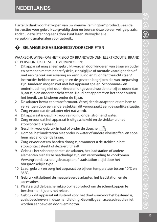 WAARSCHUWING - OM HET RISICO OP BRANDWONDEN, ELEKTROCUTIE, BRAND OF PERSOONLIJK LETSEL TE VERMINDEREN: 1 Dit apparaat mag alleen gebruikt worden door kinderen van 8 jaar en ouder en personen met mindere fysieke, zintuiglijke of mentale vaardigheden of met een gebrek aan ervaring en kennis, indien zij onder toezicht staan/ instructies hebben ontvangen en de gevaren begrijpen die van toepassing zijn. Kinderen mogen niet met het apparaat spelen. Schoonmaak en onderhoud mag niet door kinderen uitgevoerd worden tenzij ze ouder dan 8 jaar zijn en onder toezicht staan. Houd het apparaat en het snoer buiten het bereik van kinderen onder de 8 jaar. 2 De adapter bevat een transformator. Verwijder de adapter niet om hem te vervangen door een andere stekker, dit veroorzaakt een gevaarlijke situatie. 3 Zorg ervoor dat de adapter niet nat wordt. 4 Dit apparaat is geschikt voor reiniging onder stromend water. 5 Zorg ervoor dat het apparaat is uitgeschakeld en de stekker uit het stopcontact is gehaald. 6 Geschikt voor gebruik in bad of onder de douche. 7 Dompel het laadstation niet onder in water of andere vloeistoffen, en spoel hem niet af onder de kraan. 8 Zorg ervoor dat uw handen droog zijn wanneer u de stekker in het stopcontact steekt of deze eruit haalt. 9 Gebruik het scheerapparaat, de adapter, het laadstation of andere elementen niet als ze beschadigd zijn, om verwonding te voorkomen. Vervang een beschadigde adapter of laadstation altijd door het oorspronkelijke type. 10 Laad, gebruik en berg het apparaat op bij een temperatuur tussen 10°C en 35°C. 11 Gebruik uitsluitend de meegeleverde adapter, het laadstation en de accessoires. 12 Plaats altijd de beschermkap op het product om de scheerkoppen te beschermen tijdens het reizen. 13 Gebruik dit apparaat uitsluitend voor het doel waarvoor het bestemd is, zoals beschreven in deze handleiding. Gebruik geen accessoires die niet worden aanbevolen door Remington.
