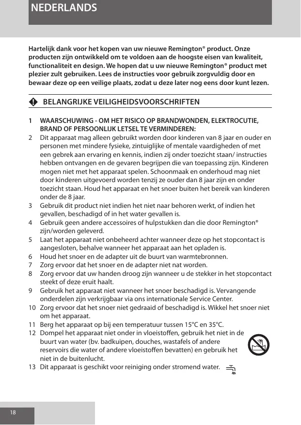WAARSCHUWING - OM HET RISICO OP BRANDWONDEN, ELEKTROCUTIE, BRAND OF PERSOONLIJK LETSEL TE VERMINDEREN: Dit apparaat mag alleen gebruikt worden door kinderen van 8 jaar en ouder en personen met mindere fysieke, zintuiglijke of mentale vaardigheden of met een gebrek aan ervaring en kennis, indien zij onder toezicht staan/ instructies hebben ontvangen en de gevaren begrijpen die van toepassing zijn. Kinderen mogen niet met het apparaat spelen. Schoonmaak en onderhoud mag niet door kinderen uitgevoerd worden tenzij ze ouder dan 8 jaar zijn en onder toezicht staan. Houd het apparaat en het snoer buiten het bereik van kinderen onder de 8 jaar. Gebruik dit product niet indien het niet naar behoren werkt, of indien het gevallen, beschadigd of in het water gevallen is. Gebruik geen andere accessoires of hulpstukken dan die door Remington® zijn/worden geleverd. Laat het apparaat niet onbeheerd achter wanneer deze op het stopcontact is aangesloten, behalve wanneer het apparaat aan het opladen is. Houd het snoer en de adapter uit de buurt van warmtebronnen. Zorg ervoor dat het snoer en de adapter niet nat worden. Zorg ervoor dat uw handen droog zijn wanneer u de stekker in het stopcontact steekt of deze eruit haalt. Gebruik het apparaat niet wanneer het snoer beschadigd is. Vervangende onderdelen zijn verkrijgbaar via ons internationale Service Center. Zorg ervoor dat het snoer niet gedraaid of beschadigd is. Wikkel het snoer niet om het apparaat. Berg het apparaat op bij een temperatuur tussen 15°C en 35°C. Dompel het apparaat niet onder in vloeistoffen, gebruik het niet in de buurt van water (bv. badkuipen, douches, wastafels of andere reservoirs die water of andere vloeistoffen bevatten) en gebruik het niet in de buitenlucht. Dit apparaat is geschikt voor reiniging onder stromend water.