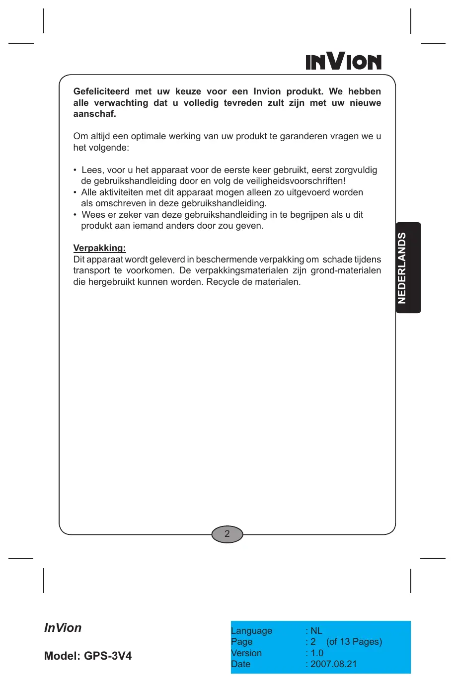 InVion Model: GPS-3V4 Language Page Version Date : FR : 12 (of 13 Pages) : 1.0 : 2007.08.21 FRANÇAIS Réclamations et Garantie InVion Model: GPS-3V4 Language Page Version Date : FR : 13 (of 13 Pages) : 1.0 : 2007.08.21 GPS NAVIGATIESYSTEEM GPS-3V4 GEBRUIKSHANDLEIDING InVion Model: GPS-3V4 Language Page Version Date : NL : (of 13 Pages) : 1.0 : 2007.08.21 Gefeliciteerd met uw keuze voor een Invion produkt. We hebben alle verwachting dat u volledig tevreden zult zijn met uw nieuwe aanschaf. Om altijd een optimale werking van uw produkt te garanderen vragen we u het volgende: Verpakking: Dit apparaat wordt geleverd in beschermende verpakking om schade tijdens transport te voorkomen. De verpakkingsmaterialen zijn grond-materialen die hergebruikt kunnen worden. Recycle de materialen.