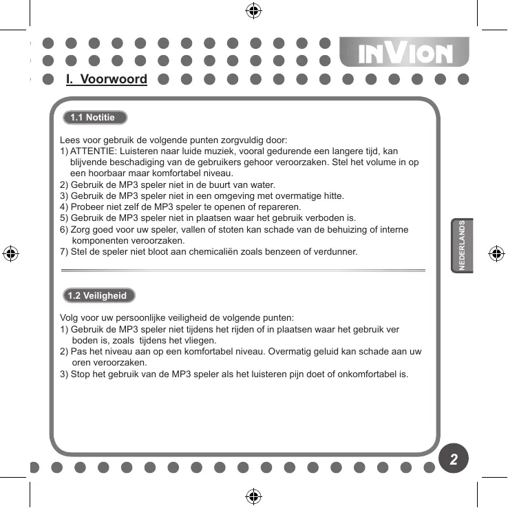 1) Gebruik de MP3 speler niet tijdens het rijden of in plaatsen waar het gebruik ver