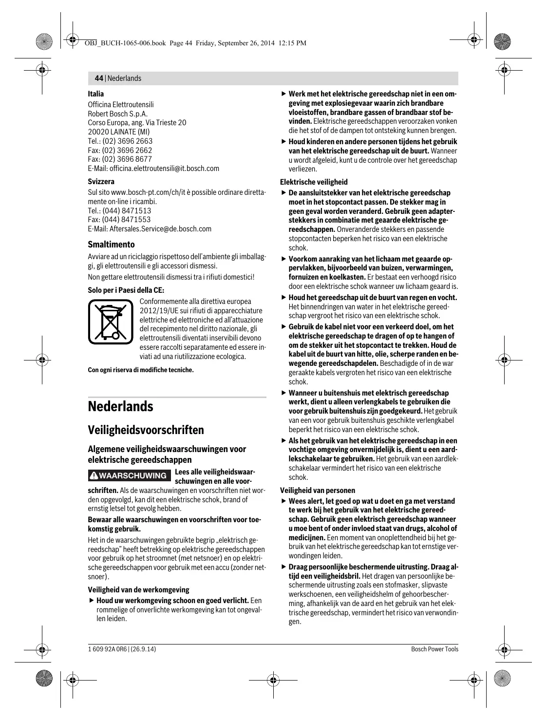 Conformiteitsverklaring We verklaren op onze verantwoordelijkheid dat het onder „Technische gegevens” beschreven product aan alle desbetreffende bepalingen van de richtlijnen 2011/65/EU, 2014/30/EU, 2006/42/EG inclusief van de wijzigingen ervan voldoet en met de volgende normen overeenstemt EN 60745-1, EN 60745-2-11. Technisch dossier (2006/42/EG) bij: Robert Bosch GmbH, PT/ETM9, 70764 Leinfelden-Echterdingen, GERMANY Henk Becker Helmut Heinzelmann Executive Vice President Head of Product Certification Engineering PT/ETM9
