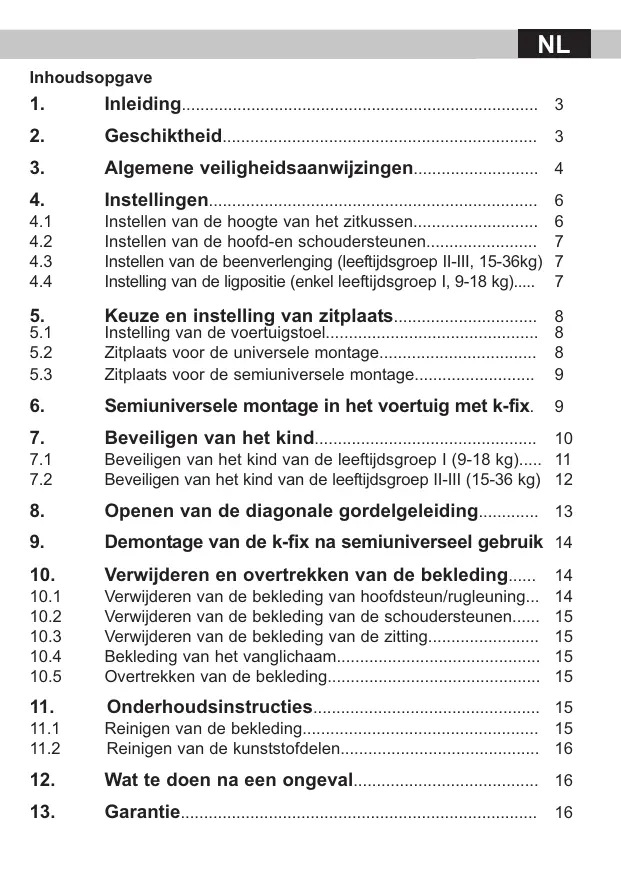 Réglage de l’allonge pour les jambes (groupes II & III, 15 - 36 kg) Réglage de la position couchée (uniquement groupe I, 9-18kg) Choix et réglage de l'assise Réglage du siège du véhicule Assise pour pose universelle Assise pour pose semi-universelle