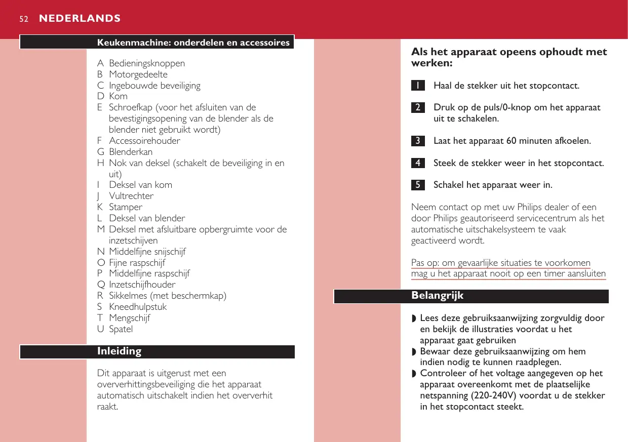 ◗ Laat het apparaat nooit zonder toezicht werken. ◗ Schakel het apparaat nooit uit door het deksel te draaien. Druk altijd op de puls/0-knop om het apparaat uit te schakelen. ◗ Schakel het apparaat uit voordat u accessoires van het apparaat losmaakt. ◗ Dompel het motorgedeelte nooit in water of een andere vloeistof en spoel het niet af onder de kraan. Gebruik alleen een vochtige doek om het motorgedeelte schoon te maken. ◗ Wanneer u de blenderkan, de kom en de schroefkap op de juiste wijze monteert, hoort u een klik. ◗ De mengschijf, het sikkelmes en het kneedhulpstuk kunnen op de accessoirehouder in de kom geplaatst worden. ◗ Verwijder altijd de beschermkap van het sikkelmes wanneer u dit mes gebruikt. ◗ Raak de snijkanten van de messen en de inzetschijven niet aan, vooral niet wanneer de stekker van het apparaat nog in het stopcontact zit. ◗ Als één van de messen vastloopt, haal dan eerst de stekker uit het stopcontact voordat u de ingrediënten waarop het mes is vastgelopen verwijdert. ◗ Laat hete ingrediënten afkoelen voordat u ze in de keukenmachine verwerkt (maximum temperatuur 80cC).