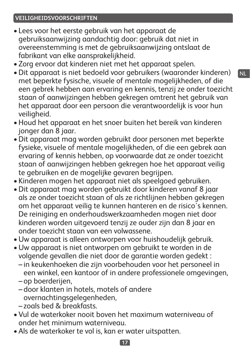 • Lees voor het eerste gebruik van het apparaat de gebruiksaanwijzing aandachtig door: gebruik dat niet in overeenstemming is met de gebruiksaanwijzing ontslaat de fabrikant van elke aansprakelijkheid. • Zorg ervoor dat kinderen niet met het apparaat spelen. • Dit apparaat is niet bedoeld voor gebruikers (waaronder kinderen) met beperkte fysische, visuele of mentale mogelijkheden, of die een gebrek hebben aan ervaring en kennis, tenzij ze onder toezicht staan of aanwijzingen hebben gekregen omtrent het gebruik van het apparaat door een persoon die verantwoordelijk is voor hun veiligheid. • Houd het apparaat en het snoer buiten het bereik van kinderen jonger dan 8 jaar. • Dit apparaat mag worden gebruikt door personen met beperkte fysieke, visuele of mentale mogelijkheden, of die een gebrek aan ervaring of kennis hebben, op voorwaarde dat ze onder toezicht staan of aanwijzingen hebben gekregen hoe het apparaat veilig te gebruiken en de mogelijke gevaren begrijpen. • Kinderen mogen het apparaat niet als speelgoed gebruiken. • Dit apparaat mag worden gebruikt door kinderen vanaf 8 jaar als ze onder toezicht staan of als ze richtlijnen hebben gekregen om het apparaat veilig te kunnen hanteren en de risico's kennen. De reiniging en onderhoudswerkzaamheden mogen niet door kinderen worden uitgevoerd tenzij ze ouder zijn dan 8 jaar en onder toezicht staan van een volwassene. • Uw apparaat is alleen ontworpen voor huishoudelijk gebruik. • Uw apparaat is niet ontworpen om gebruikt te worden in de volgende gevallen die niet door de garantie worden gedekt : ––in keukenhoeken die zijn voorbehouden voor het personeel in een winkel, een kantoor of in andere professionele omgevingen, ––op boerderijen, ––door klanten in hotels, motels of andere overnachtingsgelegenheden, ––zoals bed & breakfasts. • Vul de waterkoker nooit boven het maximum waterniveau of onder het minimum waterniveau. • Als de waterkoker te vol is, kan er water uitspatten. 17