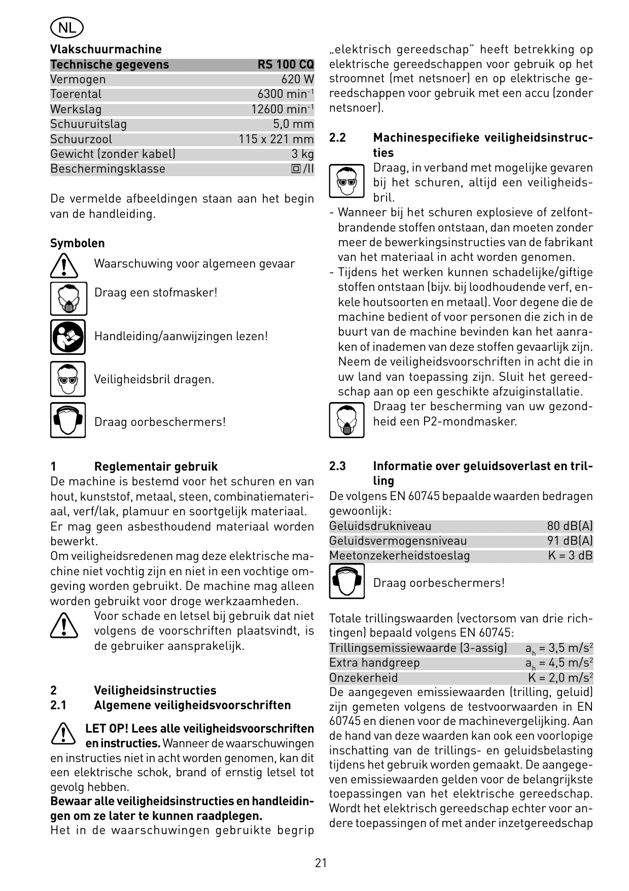 Les valeurs typiques obtenues selon EN 60745 sont les suivantes : Niveau de pression acoustique 80 dB(A) Niveau de puissance sonore 91 dB(A) Majoration pour incertitude de mesure K = 3 dB Pour des raisons de sécurité électrique, cette machine ne doit pas être humide ni être utilisée dans un environnement humide. Cette machine ne doit être utilisée que pour un polissage à sec. L‘utilisateur est responsable des dégâts ou accidents qu‘il peut provoquer en ne respectant pas les dispositions de sécurité.