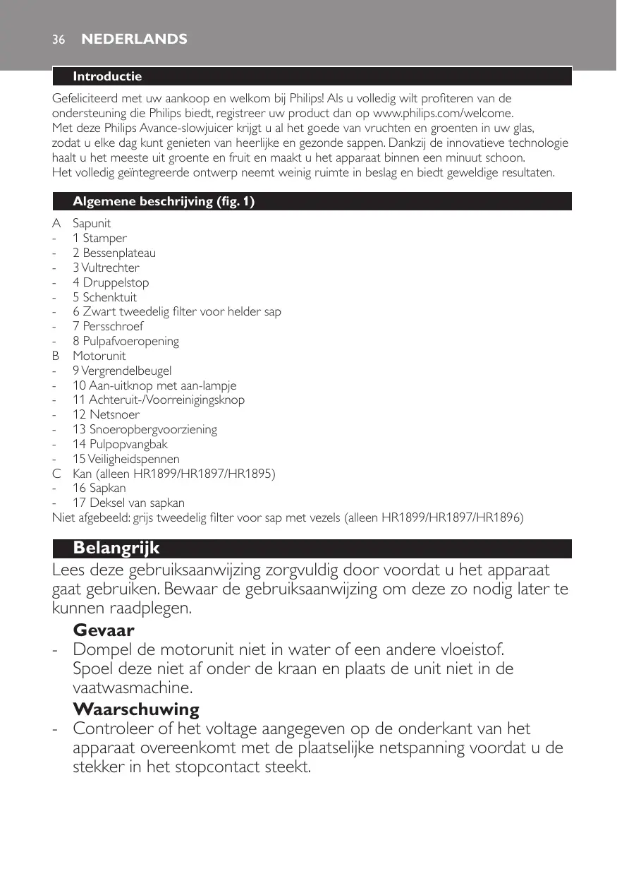 NEDERLANDS Introductie Gefeliciteerd met uw aankoop en welkom bij Philips! Als u volledig wilt profiteren van de ondersteuning die Philips biedt, registreer uw product dan op www.philips.com/welcome. Met deze Philips Avance-slowjuicer krijgt u al het goede van vruchten en groenten in uw glas, zodat u elke dag kunt genieten van heerlijke en gezonde sappen. Dankzij de innovatieve technologie haalt u het meeste uit groente en fruit en maakt u het apparaat binnen een minuut schoon. Het volledig geïntegreerde ontwerp neemt weinig ruimte in beslag en biedt geweldige resultaten. Algemene beschrijving (fig. 1) A Sapunit -- 1 Stamper -- 2 Bessenplateau -- 3 Vultrechter -- 4 Druppelstop -- 5 Schenktuit -- 6 Zwart tweedelig filter voor helder sap -- 7 Persschroef -- 8 Pulpafvoeropening B Motorunit -- 9 Vergrendelbeugel -- 10 Aan-uitknop met aan-lampje -- 11 Achteruit-/Voorreinigingsknop -- 12 Netsnoer -- 13 Snoeropbergvoorziening -- 14 Pulpopvangbak -- 15 Veiligheidspennen C Kan (alleen HR1899/HR1897/HR1895) -- 16 Sapkan -- 17 Deksel van sapkan Niet afgebeeld: grijs tweedelig filter voor sap met vezels (alleen HR1899/HR1897/HR1896) Belangrijk Lees deze gebruiksaanwijzing zorgvuldig door voordat u het apparaat gaat gebruiken. Bewaar de gebruiksaanwijzing om deze zo nodig later te kunnen raadplegen. Gevaar -- Dompel de motorunit niet in water of een andere vloeistof. Spoel deze niet af onder de kraan en plaats de unit niet in de vaatwasmachine. Waarschuwing -- Controleer of het voltage aangegeven op de onderkant van het apparaat overeenkomt met de plaatselijke netspanning voordat u de stekker in het stopcontact steekt. NEDERLANDS 37 -- Gebruik het apparaat niet als de stekker, het netsnoer of andere onderdelen beschadigd zijn. Als het netsnoer beschadigd is, dient u het te laten vervangen door Philips, een door Philips geautoriseerd servicecentrum of personen met vergelijkbare kwalificaties, om gevaar te voorkomen. -- Dit apparaat is uitsluitend bedoeld voor huishoudelijk gebruik. Bij (semi-)professioneel of onjuist gebruik en elk gebruik niet overeenkomstig de gebruiksaanwijzing vervalt het recht op garantie en aanvaardt Philips geen aansprakelijkheid voor eventueel hierdoor ontstane schade. -- Dit apparaat kan worden gebruikt door personen met verminderde lichamelijke, zintuiglijke of geestelijke capaciteiten of weinig ervaring en kennis, mits zij toezicht of instructie hebben ontvangen aangaande veilig gebruik van het apparaat, en zij de gevaren van het gebruik begrijpen. -- Dit apparaat mag niet worden gebruikt door kinderen. Houd het apparaat en het netsnoer buiten bereik van kinderen. -- Kinderen mogen niet met het apparaat spelen. -- Steek nooit uw vingers of een voorwerp in de vultrechter wanneer het apparaat in werking is. Gebruik hiervoor uitsluitend de stamper. -- Trek altijd de stekker uit het stopcontact als u het apparaat onbeheerd achterlaat en voordat u het apparaat in elkaar zet, uit elkaar haalt of schoonmaakt. -- Wikkel het netsnoer altijd volledig af voordat u de het apparaat inschakelt. -- Laat het apparaat nooit zonder toezicht werken. Let op -- Gebruik geen accessoires of onderdelen van andere fabrikanten of die niet specifiek door Philips worden aanbevolen. Als u dergelijke accessoires of onderdelen gebruikt, vervalt de garantie. -- Plaats het apparaat altijd op een stabiele, vlakke en horizontale ondergrond. -- Gebruik het apparaat alleen binnenshuis. -- Vermijd contact met bewegende onderdelen. -- Zorg dat alle onderdelen op de juiste wijze zijn bevestigd voordat u het apparaat inschakelt. -- Gebruik het apparaat alleen als de vergrendelbeugel in de vergrendelde stand staat. -- Ontgrendel de vergrendelbeugel pas nadat u het apparaat hebt uitgeschakeld en de persschroef tot stilstand is gekomen.