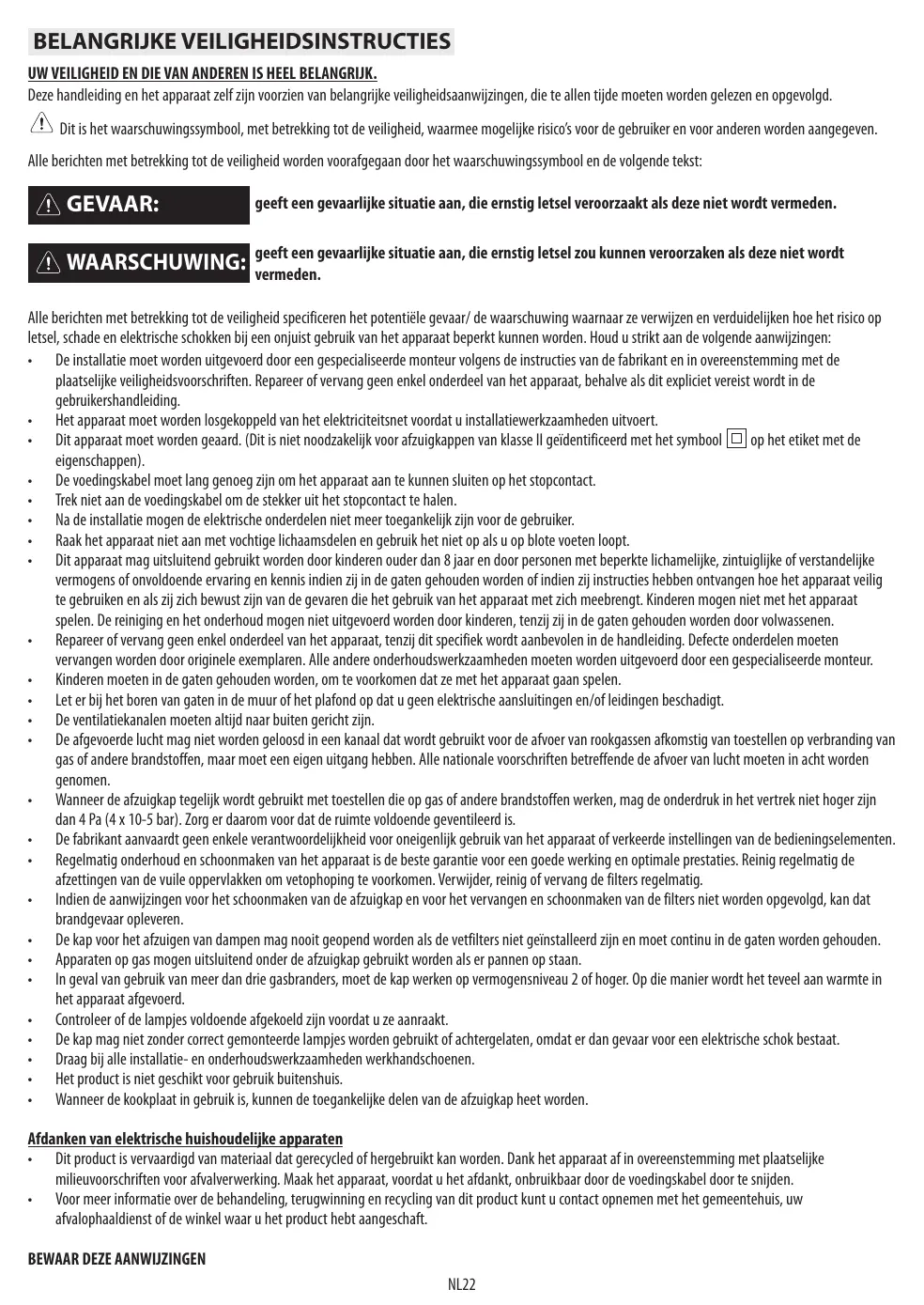 12. Hang de afzuigkap aan de muur. 13. Stel de horizontale ophanging van de kap bij. 14. Regel de afstand van de afzuigkap tot de muur. 15. Teken het/de gat(en) voor de definitieve bevestiging van de afzuigkap op de muur zoals aangegeven. 16. Haal de afzuigkap van de muur. 17. Boor gaten en steek pluggen in de muur zoals aangegeven. 18. Hang de afzuigkap weer aan de muur. 19. Bevestig de kap definitief met schroeven aan de muur zoals aangegeven. 20. Bevestig de verbindingsring op de afvoeruitgang. 21. Bevestig de aansluitdoos met de reeds gedeeltelijk aangedraaide schroeven op de motorbehuizing. Opmerking: van de doos bestaan twee types, met bevestiging aan de voorkant of aan de achterkant. Volg de instructies in de afbeeldingen (21a en 21b) op basis van het door u aangeschafte model). 22. Steek het netsnoer in de aansluiting. 23. Bevestig de kabelklem aan het snoer. BELANGRIJK: Deze handeling moet verplicht worden uitgevoerd. De klem zorgt ervoor dat het netsnoer niet per ongeluk losgetrokken wordt. Voer de aansluiting op de netvoeding van uw woning uit. 24. Sluit een rookafvoerbuis aan op de koppelingsring; de afvoerbuis moet naar buiten gericht worden (versie met afzuiging naar buiten) of naar de luchtstroomrichter (versie met luchtcirculatie). 25. Plaats de schouw over de kap zodat de afzuiggroep volledig afgedekt is. 26. Haal het bovenste gedeelte weg en bevestig de schouw met de schroeven zoals aangegeven. 27. Installeer het koolstoffilter (alleen bij filterversie) enmonteer de vetfilter(s) weer. Controleer of de afzuigkap goed werkt aan de hand van de paragraaf Beschrijving en gebruik van de afzuigkap.