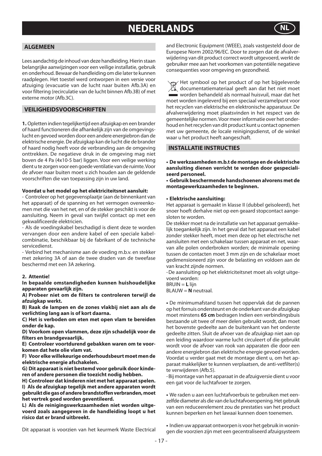 NEDERLANDS ALGEMEEN Lees aandachtig de inhoud van deze handleiding. Hierin staan belangrijke aanwijzingen voor een veilige installatie, gebruik en onderhoud. Bewaar de handleiding om die later te kunnen raadplegen. Het toestel werd ontworpen in een versie voor afzuiging (evacuatie van de lucht naar buiten Afb.3A) en voor filtering (recirculatie van de lucht binnen Afb.3B) of met externe motor (Afb.3C). VEILIGHEIDSVOORSCHRIFTEN