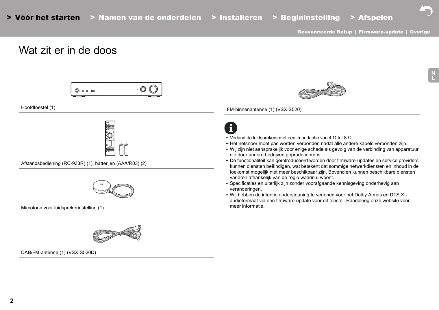 Vóór het starten Wat zit er in de doos 2 Namen van de onderdelen Voorpaneel 3 Achterpaneel 4 Afstandsbediening 6 Display 7 Installeren 1. De luidsprekers verbinden 8 2. De TV verbinden 11 3. Verbind de HDMI AV-componenten 12 4. Verbind de audiocomponenten 13 5. Verbinden met andere kabels 14 Begininstelling Eerste Setup met de Automatische Opstart Wizard 15 Afspelen Afspelen van een AV-component 18 Internetradio 19 Spotify 21 Music Server 22 USB-opslagapparaat 24 AirPlay® 26 BLUETOOTH® Afspelen 27 Naar de FM/DAB-radio luisteren 28 Luistermodussen 31 AV Adjust 40 Geavanceerde Setup System Setup 42 MCACC 51 Network/Bluetooth 54 Firmware-update Firmware-update 57 Overige Problemen oplossen 60 Algemene specificaties 65 HDMI 67 Licentie en handelsm 68