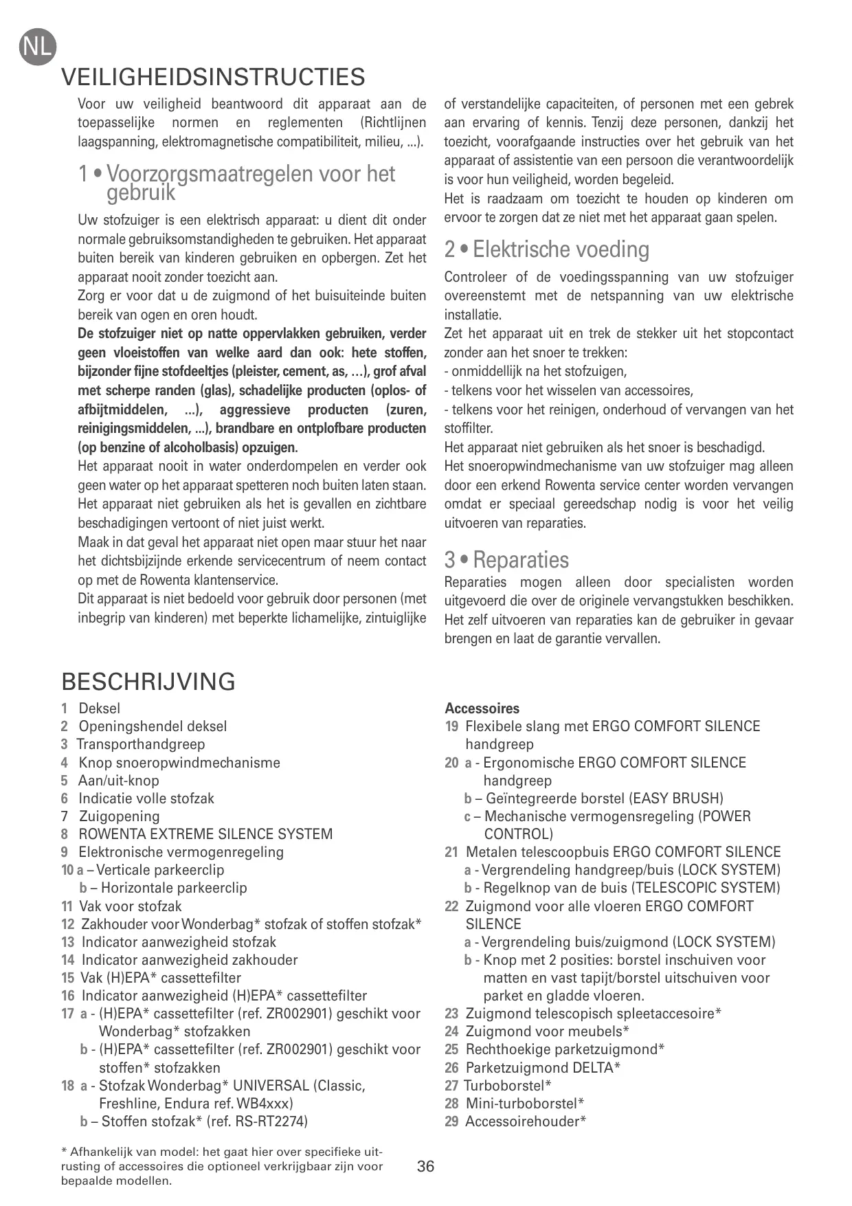 Accessoires 19 Flexibele slang met ERGO COMFORT SILENCE handgreep 20 a - Ergonomische ERGO COMFORT SILENCE handgreep b – Geïntegreerde borstel (EASY BRUSH) c – Mechanische vermogensregeling (POWER CONTROL) 21 Metalen telescoopbuis ERGO COMFORT SILENCE a - Vergrendeling handgreep/buis (LOCK SYSTEM) b - Regelknop van de buis (TELESCOPIC SYSTEM) 22 Zuigmond voor alle vloeren ERGO COMFORT SILENCE a - Vergrendeling buis/zuigmond (LOCK SYSTEM) b - Knop met 2 posities: borstel inschuiven voor matten en vast tapijt/borstel uitschuiven voor parket en gladde vloeren. 23 Zuigmond telescopisch spleetaccesoire* 24 Zuigmond voor meubels* 25 Rechthoekige parketzuigmond* 26 Parketzuigmond DELTA* 27 Turboborstel* 28 Mini-turboborstel* 29 Accessoirehouder*