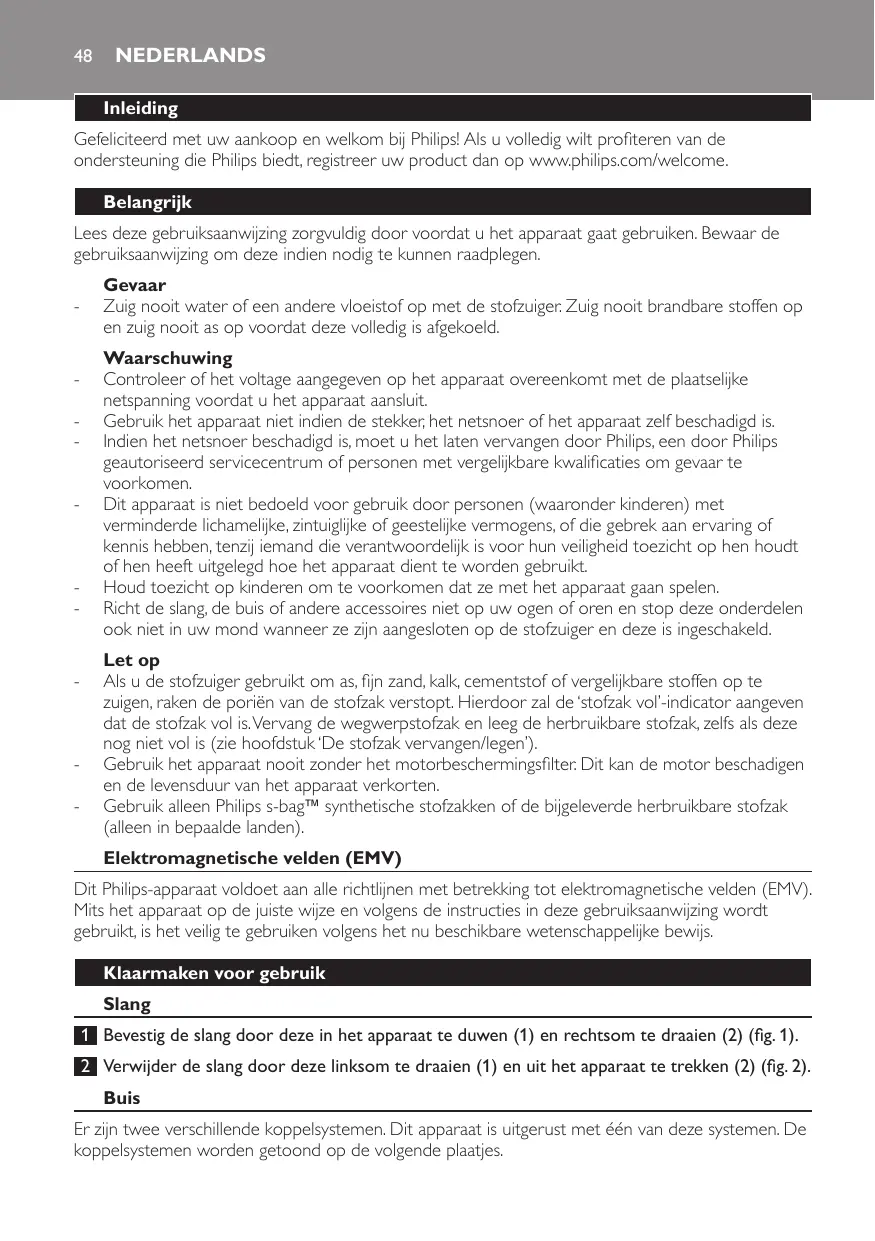 Gefeliciteerd met uw aankoop en welkom bij Philips! Als u volledig wilt profiteren van de ondersteuning die Philips biedt, registreer uw product dan op www.philips.com/welcome. Belangrijk Lees deze gebruiksaanwijzing zorgvuldig door voordat u het apparaat gaat gebruiken. Bewaar de gebruiksaanwijzing om deze indien nodig te kunnen raadplegen. Gevaar -- Zuig nooit water of een andere vloeistof op met de stofzuiger. Zuig nooit brandbare stoffen op en zuig nooit as op voordat deze volledig is afgekoeld. Waarschuwing -- Controleer of het voltage aangegeven op het apparaat overeenkomt met de plaatselijke netspanning voordat u het apparaat aansluit. -- Gebruik het apparaat niet indien de stekker, het netsnoer of het apparaat zelf beschadigd is. -- Indien het netsnoer beschadigd is, moet u het laten vervangen door Philips, een door Philips geautoriseerd servicecentrum of personen met vergelijkbare kwalificaties om gevaar te voorkomen. -- Dit apparaat is niet bedoeld voor gebruik door personen (waaronder kinderen) met verminderde lichamelijke, zintuiglijke of geestelijke vermogens, of die gebrek aan ervaring of kennis hebben, tenzij iemand die verantwoordelijk is voor hun veiligheid toezicht op hen houdt of hen heeft uitgelegd hoe het apparaat dient te worden gebruikt. -- Houd toezicht op kinderen om te voorkomen dat ze met het apparaat gaan spelen. -- Richt de slang, de buis of andere accessoires niet op uw ogen of oren en stop deze onderdelen ook niet in uw mond wanneer ze zijn aangesloten op de stofzuiger en deze is ingeschakeld. Let op -- Als u de stofzuiger gebruikt om as, fijn zand, kalk, cementstof of vergelijkbare stoffen op te zuigen, raken de poriën van de stofzak verstopt. Hierdoor zal de ‘stofzak vol’-indicator aangeven dat de stofzak vol is. Vervang de wegwerpstofzak en leeg de herbruikbare stofzak, zelfs als deze nog niet vol is (zie hoofdstuk ‘De stofzak vervangen/legen’). -- Gebruik het apparaat nooit zonder het motorbeschermingsfilter. Dit kan de motor beschadigen en de levensduur van het apparaat verkorten. -- Gebruik alleen Philips s-bag` synthetische stofzakken of de bijgeleverde herbruikbare stofzak (alleen in bepaalde landen). Elektromagnetische velden (EMV) Dit Philips-apparaat voldoet aan alle richtlijnen met betrekking tot elektromagnetische velden (EMV). Mits het apparaat op de juiste wijze en volgens de instructies in deze gebruiksaanwijzing wordt gebruikt, is het veilig te gebruiken volgens het nu beschikbare wetenschappelijke bewijs. Klaarmaken voor gebruik Slang 1 Bevestig de slang door deze in het apparaat te duwen (1) en rechtsom te draaien (2) (fig. 1). 2 Verwijder de slang door deze linksom te draaien (1) en uit het apparaat te trekken (2) (fig. 2). Buis Er zijn twee verschillende koppelsystemen. Dit apparaat is uitgerust met één van deze systemen. De koppelsystemen worden getoond op de volgende plaatjes.