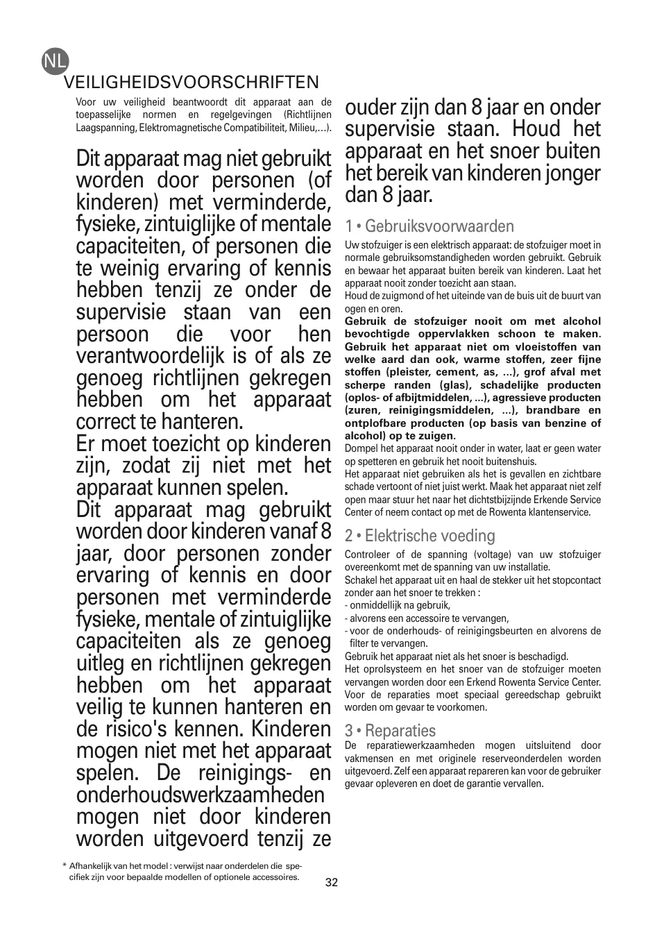 ouder zijn dan 8 jaar en onder supervisie staan. Houd het Dit apparaat mag niet gebruikt apparaat en het snoer buiten worden door personen (of het bereik van kinderen jonger kinderen) met verminderde, dan 8 jaar. fysieke, zintuiglijke of mentale 1 • Gebruiksvoorwaarden Uw stofzuiger is een elektrisch apparaat: de stofzuiger moet in capaciteiten, of personen die normale gebruiksomstandigheden worden gebruikt. Gebruik en bewaar het apparaat buiten bereik van kinderen. Laat het te weinig ervaring of kennis apparaat nooit zonder toezicht aan staan. hebben tenzij ze onder de Houd de zuigmond of het uiteinde van de buis uit de buurt van ogen en oren. supervisie staan van een Gebruik de stofzuiger nooit om met alcohol oppervlakken schoon te maken. persoon die voor hen bevochtigde Gebruik het apparaat niet om vloeistoffen van verantwoordelijk is of als ze welke aard dan ook, warme stoffen, zeer fijne (pleister, cement, as, ...), grof afval met genoeg richtlijnen gekregen stoffen scherpe randen (glas), schadelijke producten of afbijtmiddelen, ...), agressieve producten hebben om het apparaat (oplos(zuren, reinigingsmiddelen, ...), brandbare en ontplofbare producten (op basis van benzine of correct te hanteren. alcohol) op te zuigen. Er moet toezicht op kinderen Dompel het apparaat nooit onder in water, laat er geen water en gebruik het nooit buitenshuis. zijn, zodat zij niet met het opHetspetteren apparaat niet gebruiken als het is gevallen en zichtbare schade vertoont of niet juist werkt. Maak het apparaat niet zelf apparaat kunnen spelen. open maar stuur het naar het dichtstbijzijnde Erkende Service Dit apparaat mag gebruikt Center of neem contact op met de Rowenta klantenservice. worden door kinderen vanaf 8 2 • Elektrische voeding Controleer of de spanning (voltage) van uw stofzuiger jaar, door personen zonder overeenkomt met de spanning van uw installatie. ervaring of kennis en door Schakel het apparaat uit en haal de stekker uit het stopcontact aan het snoer te trekken : personen met verminderde -zonder onmiddellijk na gebruik, alvorens een accessoire te vervangen, fysieke, mentale of zintuiglijke -- voor de onderhouds- of reinigingsbeurten en alvorens de filter te vervangen. capaciteiten als ze genoeg Gebruik het apparaat niet als het snoer is beschadigd. uitleg en richtlijnen gekregen Het oprolsysteem en het snoer van de stofzuiger moeten vervangen worden door een Erkend Rowenta Service Center. hebben om het apparaat Voor de reparaties moet speciaal gereedschap gebruikt veilig te kunnen hanteren en worden om gevaar te voorkomen. de risico's kennen. Kinderen 3 • Reparaties De reparatiewerkzaamheden mogen uitsluitend door mogen niet met het apparaat vakmensen en met originele reserveonderdelen worden Zelf een apparaat repareren kan voor de gebruiker spelen. De reinigings- en uitgevoerd. gevaar opleveren en doet de garantie vervallen. onderhoudswerkzaamheden mogen niet door kinderen worden uitgevoerd tenzij ze Voor uw veiligheid beantwoordt dit apparaat aan de toepasselijke normen en regelgevingen (Richtlijnen Laagspanning, Elektromagnetische Compatibiliteit, Milieu,…).