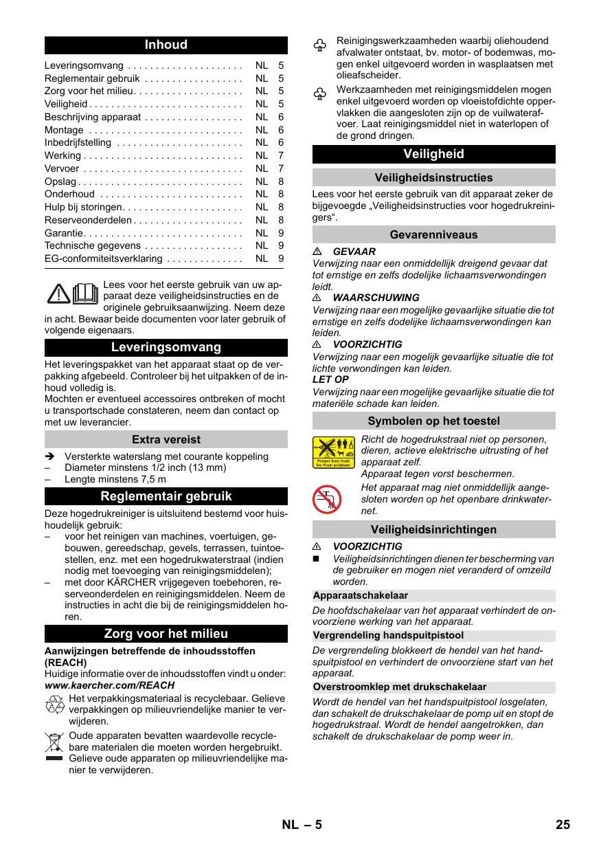 EN 60335–2–79 EN 61000–3–2: 2006+A1: 2009+A2: 2009 EN 61000–3–3: 2013 EN 62233: 2008 Procedimiento de evaluación de la conformidad aplicado 2000/14/CE: Anexo V Nivel de potencia acústica dB(A) Medido: 87 Garantizado: à rede 5 Local de armazenamento para mangueira de alta pressão 6 Alça de transporte 7 Conexão de água com peneira incorporada 8 Mangueira de aspiração do detergente com filtro de detergente e tampa 9 Reservatório de detergente 10 Peça de acoplamento para ligação da água 11 Local de armazenamento para lança 12 Local de armazenamento da pistola pulverizadora manual 13 Cabo de ligação à rede com ficha de rede 14 Roda de transporte 15 Pistola de injecção manual 16 Bloqueio da pistola pulverizadora manual 17 Botão para separar a mangueira de alta pressão da pistola pulverizadora manual 18 Mangueira de alta pressão EN 60335–1 EN 60335–2–79 EN 61000–3–2: 2006+A1: 2009+A2: 2009 EN 61000–3–3: 2013 EN 62233: 2008 Processo aplicado de avaliação de conformidade 2000/14/CE: Anexo V Nível de potência acústica dB(A) Medido: 87 EN 60335–1 EN 60335–2–79 EN 61000–3–2: 2006+A1: 2009+A2: 2009 EN 61000–3–3: 2013 EN 62233: 2008 Anvendte overensstemmelsesvurderingsprocedurer 2000/14/EF: Bilag V Lydeffektniveau dB(A) Målt: EN 60335–1 EN 60335–2–79 EN 61000–3–2: 2006+A1: 2009+A2: 2009 EN 61000–3–3: 2013 EN 62233: 2008 Anvendt metode for samsvarsvurdering 2000/14/EF: Vedlegg V Lydeffektnivå dB(A) Målt: EN 60335–1 EN 60335–2–79 EN 61000–3–2: 2006+A1: 2009+A2: 2009 EN 61000–3–3: 2013 EN 62233: 2008 Tillämpad metod för överensstämmelsevärdering 2000/14/EG: Bilaga V Ljudeffektsnivå dB(A) Upmätt: EN 60335–1 EN 60335–2–79 EN 61000–3–2: 2006+A1: 2009+A2: 2009 EN 61000–3–3: 2013 EN 62233: 2008 Sovellettu yhdenmukaisuuden analysointimenetelmä 2000/14/EY: Liite V Äänen tehotaso dB(A) EN 60335–1 EN 60335–2–79 EN 61000–3–2: 2006+A1: 2009+A2: 2009 EN 61000–3–3: 2013 EN 62233: 2008 Εφαρμοσθείσα διαδικασία συμμόρφωσης 2000/14/EΚ: Παράρτημα V στάθμη ηχητικής πίεσης dB(A) EN 60335–1 EN 60335–2–79 EN 61000–3–2: 2006+A1: 2009+A2: 2009 EN 61000–3–3: 2013 EN 62233: 2008 Kullanılan uyumluluk değerlendirme yöntemleri 2000/14/EG: Ek V Ses şiddeti dB(A) Ölçülen: 87 EN 60335–1 EN 60335–2–79 EN 61000–3–2: 2006+A1: 2009+A2: 2009 EN 61000–3–3: 2013 EN 62233: 2008 Примененный порядок оценки соответствия 2000/14/ЕС: Приложение V Уровень мощности звука dB(A) EN 60335–1 EN 60335–2–79 EN 61000–3–2: 2006+A1: 2009+A2: 2009 EN 61000–3–3: 2013 EN 62233: 2008 Követett megfelelés megállapítási eljárás: 2000/14/EK: V. függelék Hangteljesítményszint dB(A) EN 60335–1 EN 60335–2–79 EN 61000–3–2: 2006+A1: 2009+A2: 2009 EN 61000–3–3: 2013 EN 62233: 2008 Použitý postup posuzování shody: 2000/14/ES: Příloha V Hladinu akustického dB(A) Namerenou: EN 60335–1 EN 60335–2–79 EN 61000–3–2: 2006+A1: 2009+A2: 2009 EN 61000–3–3: 2013 EN 62233: 2008 Postopek ocenjevanja skladnosti: 2000/14/ES: Priloga V Raven zvočne moči dB(A) Izmerjeno: EN 60335–1 EN 60335–2–79 EN 61000–3–2: 2006+A1: 2009+A2: 2009 EN 61000–3–3: 2013 EN 62233: 2008 Zastosowana metoda oceny zgodności 2000/14/WE: Załącznik V Poziom mocy akustycznej dB(A) Zmierzony: Trepte de pericol  PERICOL Indicaţie referitoare la un pericol iminent, care duce la vătămări corporale grave sau moarte. 몇 AVERTIZARE Indicaţie referitoare la o posibilă situaţie periculoasă, care ar putea duce la vătămări corporale grave sau moarte. 몇 PRECAUŢIE Indică o posibilă situaţie periculoasă, care ar putea duce la vătămări corporale uşoare. ATENŢIE Indicaţie referitoare la o posibilă situaţie periculoasă, care ar putea duce la pagube materiale. 14 Roată de transport 15 Pistol de pulverizare 16 Zăvor pistol de pulverizat 17 Buton de detaşare a furtunului de înaltă presiune de pistolul de pulverizat 18 Furtun de înaltă presiune 19 Lance cu reglaj de presiune (Vario Power) Pentru lucrările de curăţare uzuale. Presiunea de lucru poate fi reglată fără trepte între „Min” şi „Max”. În poziţia „Min” puteţi adăuga soluţia de curăţat. Pentru reglarea presiunii de lucru, eliberaţi maneta pistolului manual de stropit şi rotiţi lancea în poziţia dorită. şi se spală sub jet de apă.  Evacuarea aerului din aparat: Porniţi aparatul cu furtunul de înaltă presiune deconectat şi lăsaţi-l să funcţioneze (max. 2 min.), până ce apa iese pe ieşirea de înaltă presiune fără a conţine bule de aer. Opriţi aparatul şi racordaţi furtunul de înaltă presiune.
