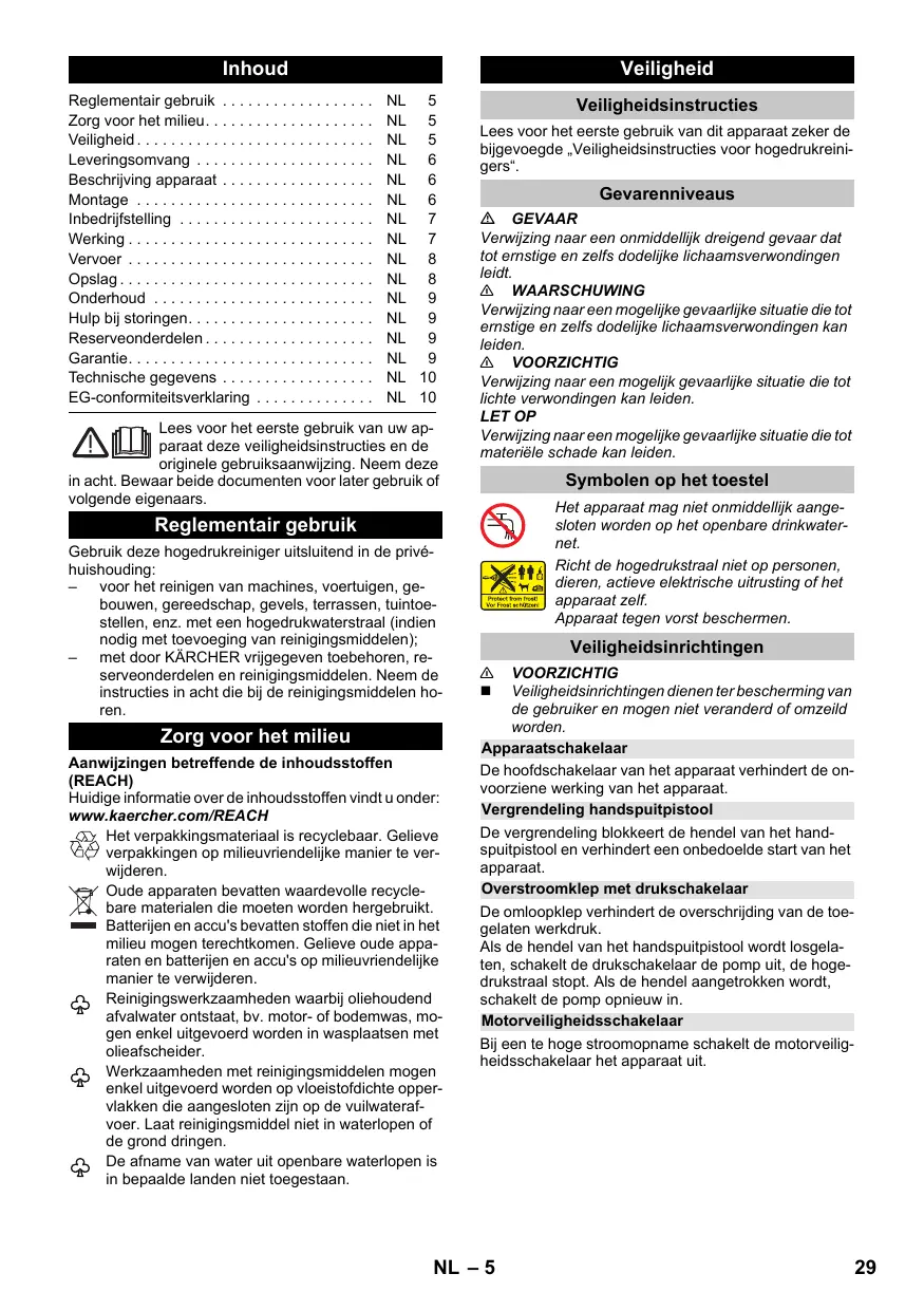 Instructions relatives aux ingrédients (REACH) Les informations actuelles relatives aux ingrédients se trouvent sous : www.kaercher.com/REACH Les matériels d'emballage sont recyclables. Éliminez l'emballage d'une manière respectueuse de l'environnement. Les appareils ancien modèle contiennent des matériaux précieux recyclables qui doivent être amenés à un système de recyclage. Les batteries et les accumulateurs contiennent des substances ne devant pas être tout simplement jetées. Veuillez éliminer les anciens appareils ainsi que les batteries ou les accumulateurs d'une manière respectueuse de l'environnement. Tous travaux de nettoyage produisant des eaux usées contenant de l’huile, par exemple un nettoyage de moteur ou de bas de caisse, doivent uniquement être effectués à des postes de lavage équipés d’un séparateur d’huile. Les travaux avec du détergent ne doivent être faits que sur des plans de travail étanches aux liquides, avec raccord à la canalisation d'eaux usées. Ne pas laisser le détergent s'infiltrer dans les eaux ou dans le sol. Il est dans certains pays interdit de prélever de l'eau dans les cours d'eau publiques.