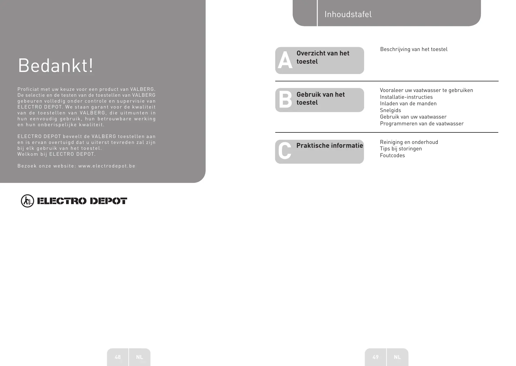 Overzicht van het toestel Beschrijving van het toestel Gebruik van het toestel Vooraleer uw vaatwasser te gebruiken