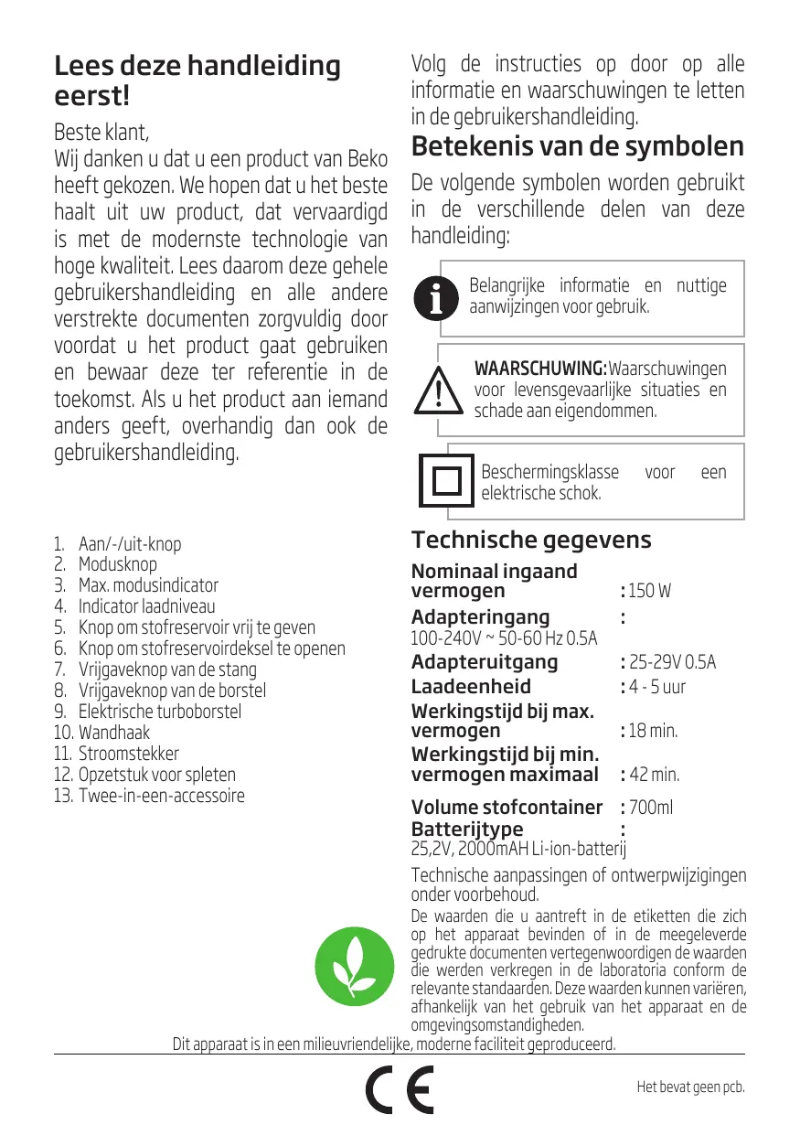 4. Indicateur de niveau de charge 5. Bouton de déverrouillage du bac à poussière 6. Bouton de déverrouillage du couvercle du bac à poussière 7. Bouton de libération du tuyau 8. Bouton de libération de la brosse 9. Brosse turbo électrique 10. Crochet mural 11. Fiche électrique Informations importantes et conseils utiles concernant l’utilisation de l’appareil.