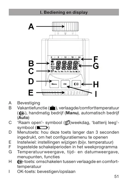 Bevestiging Vakantiefunctie ( ), verlaagde/comforttemperatuur ), handmatig bedrijf (Manu), automatisch bedrijf (Auto) ‘Raam open’- symbool ( )weekdag, ‘batterij leeg’) symbool ( Menutoets: hou deze toets langer dan 3 seconden ingedrukt, om het configuratiemenu te openen Instelwiel: instellingen wijzigen (bijv. temperatuur) Ingestelde schakelperioden in het weekprogramma Temperatuurweergave, tijd- en datumweergave, menupunten, functies -toets: omschakelen tussen verlaagde en comforttemperatuur OK-toets: bevestigen/opslaan