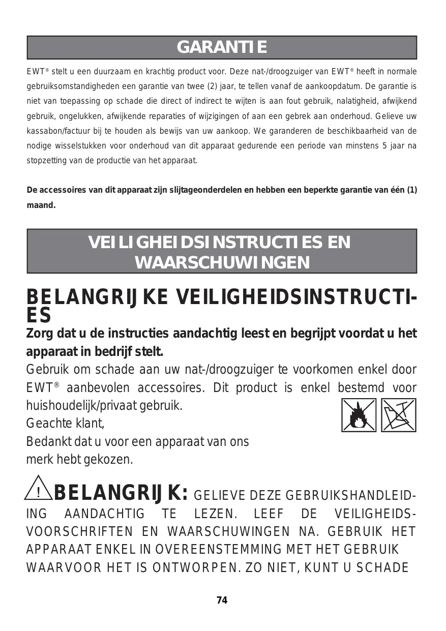 GARANTIE EWT® stelt u een duurzaam en krachtig product voor. Deze nat-/droogzuiger van EWT® heeft in normale gebruiksomstandigheden een garantie van twee (2) jaar, te tellen vanaf de aankoopdatum. De garantie is niet van toepassing op schade die direct of indirect te wijten is aan fout gebruik, nalatigheid, afwijkend gebruik, ongelukken, afwijkende reparaties of wijzigingen of aan een gebrek aan onderhoud. Gelieve uw kassabon/factuur bij te houden als bewijs van uw aankoop. We garanderen de beschikbaarheid van de nodige wisselstukken voor onderhoud van dit apparaat gedurende een periode van minstens 5 jaar na stopzetting van de productie van het apparaat. De accessoires van dit apparaat zijn slijtageonderdelen en hebben een beperkte garantie van één (1) maand. VEILIGHEIDSINSTRUCTIES EN WAARSCHUWINGEN BELANGRIJKE VEILIGHEIDSINSTRUCTIES Zorg dat u de instructies aandachtig leest en begrijpt voordat u het apparaat in bedrijf stelt. Gebruik om schade aan uw nat-/droogzuiger te voorkomen enkel door EWT® aanbevolen accessoires. Dit product is enkel bestemd voor huishoudelijk/privaat gebruik. Geachte klant, Bedankt dat u voor een apparaat van ons merk hebt gekozen. BELANGRIJK: GELIEVE DEZE GEBRUIKSHANDLEIDING AANDACHTIG TE LEZEN. LEEF DE VEILIGHEIDSVOORSCHRIFTEN EN WAARSCHUWINGEN NA. GEBRUIK HET APPARAAT ENKEL IN OVEREENSTEMMING MET HET GEBRUIK WAARVOOR HET IS ONTWORPEN. ZO NIET, KUNT U SCHADE