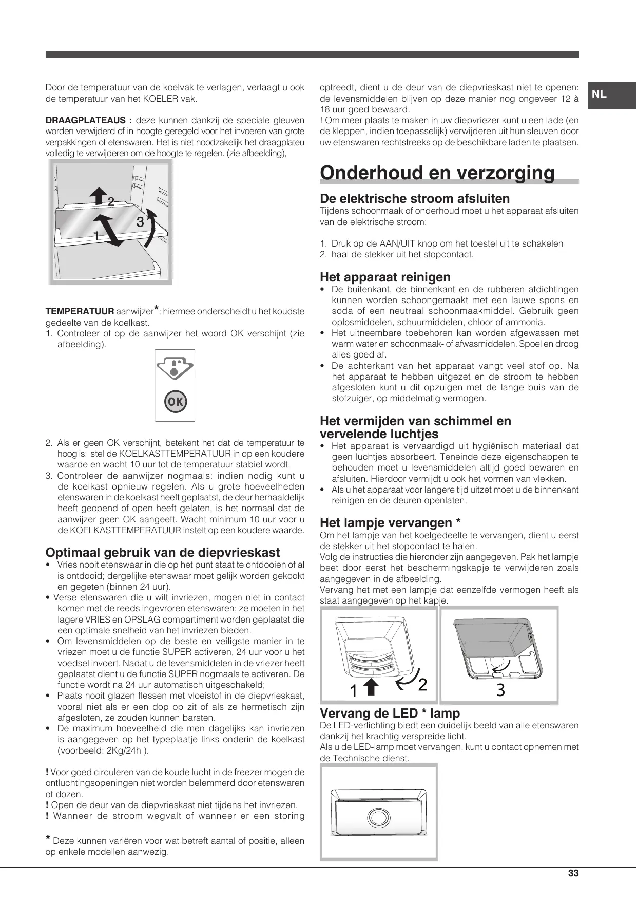 In de koelkast bevriezen de etenswaren. • De KOELKASTTEMPERATUUR is niet correct (zie Beschrijving). • De levensmiddelen staan in contact met de achterwand. De motor blijft doorlopend draaien • De SNEL INVRIEZEN knop werd ingedrukt: de gele SNEL INVRIEZEN indicator is ingeschakeld (zie Beschrijving). • De deur is niet goed dicht of wordt constant geopend. • De buitentemperatuur is erg hoog.