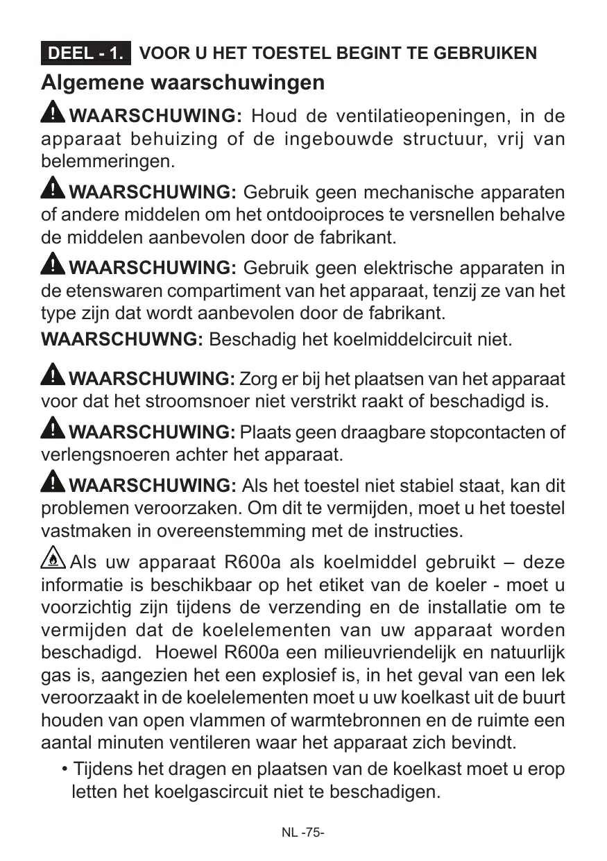 NL -74- DEEL - 1. VOOR U HET TOESTEL BEGINT TE GEBRUIKEN Algemene waarschuwingen WAARSCHUWING: Houd de ventilatieopeningen, in de apparaat behuizing of de ingebouwde structuur, vrij van belemmeringen. WAARSCHUWING: Gebruik geen mechanische apparaten of andere middelen om het ontdooiproces te versnellen behalve de middelen aanbevolen door de fabrikant. WAARSCHUWING: Gebruik geen elektrische apparaten in de etenswaren compartiment van het apparaat, tenzij ze van het type zijn dat wordt aanbevolen door de fabrikant. WAARSCHUWNG: Beschadig het koelmiddelcircuit niet. WAARSCHUWING: Zorg er bij het plaatsen van het apparaat voor dat het stroomsnoer niet verstrikt raakt of beschadigd is. WAARSCHUWING: Plaats geen draagbare stopcontacten of verlengsnoeren achter het apparaat. WAARSCHUWING: Als het toestel niet stabiel staat, kan dit problemen veroorzaken. Om dit te vermijden, moet u het toestel vastmaken in overeenstemming met de instructies. Als uw apparaat R600a als koelmiddel gebruikt – deze informatie is beschikbaar op het etiket van de koeler - moet u voorzichtig zijn tijdens de verzending en de installatie om te vermijden dat de koelelementen van uw apparaat worden beschadigd. Hoewel R600a een milieuvriendelijk en natuurlijk gas is, aangezien het een explosief is, in het geval van een lek veroorzaakt in de koelelementen moet u uw koelkast uit de buurt houden van open vlammen of warmtebronnen en de ruimte een aantal minuten ventileren waar het apparaat zich bevindt.