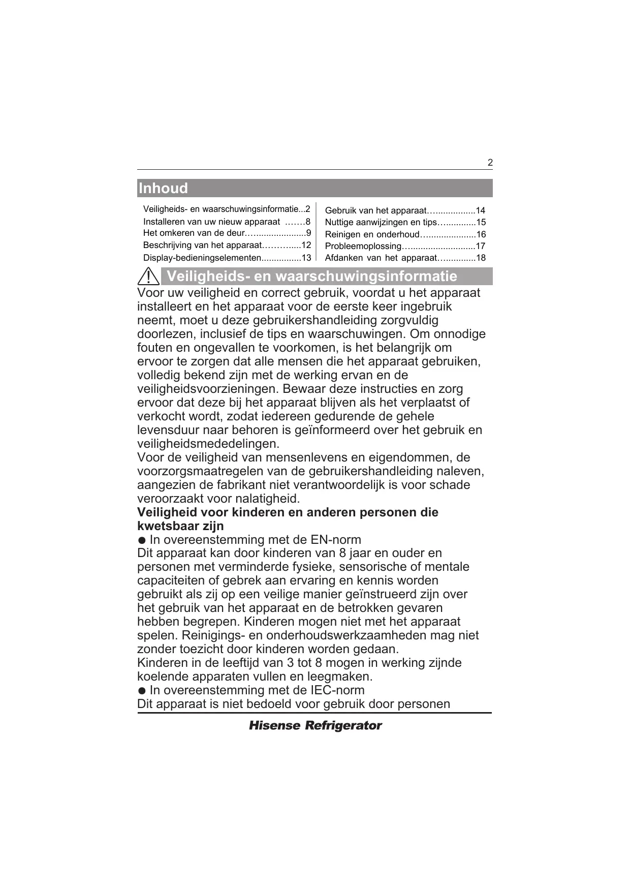 - Afdanken van het apparaat… Veiligheids- en waarschuwingsinformatie Voor uw veiligheid en correct gebruik, voordat u het apparaat installeert en het apparaat voor de eerste keer ingebruik neemt, moet u deze gebruikershandleiding zorgvuldig doorlezen, inclusief de tips en waarschuwingen. Om onnodige fouten en ongevallen te voorkomen, is het belangrijk om ervoor te zorgen dat alle mensen die het apparaat gebruiken, volledig bekend zijn met de werking ervan en de veiligheidsvoorzieningen. Bewaar deze instructies en zorg ervoor dat deze bij het apparaat blijven als het verplaatst of verkocht wordt, zodat iedereen gedurende de gehele levensduur naar behoren is geïnformeerd over het gebruik en veiligheidsmededelingen. Voor de veiligheid van mensenlevens en eigendommen, de voorzorgsmaatregelen van de gebruikershandleiding naleven, aangezien de fabrikant niet verantwoordelijk is voor schade veroorzaakt voor nalatigheid. Veiligheid voor kinderen en anderen personen die kwetsbaar zijn ● In overeenstemming met de EN-norm Dit apparaat kan door kinderen van 8 jaar en ouder en personen met verminderde fysieke, sensorische of mentale capaciteiten of gebrek aan ervaring en kennis worden gebruikt als zij op een veilige manier geïnstrueerd zijn over het gebruik van het apparaat en de betrokken gevaren hebben begrepen. Kinderen mogen niet met het apparaat spelen. Reinigings- en onderhoudswerkzaamheden mag niet zonder toezicht door kinderen worden gedaan. Kinderen in de leeftijd van 3 tot 8 mogen in werking zijnde koelende apparaten vullen en leegmaken. ● In overeenstemming met de IEC-norm Dit apparaat is niet bedoeld voor gebruik door personen p. 18