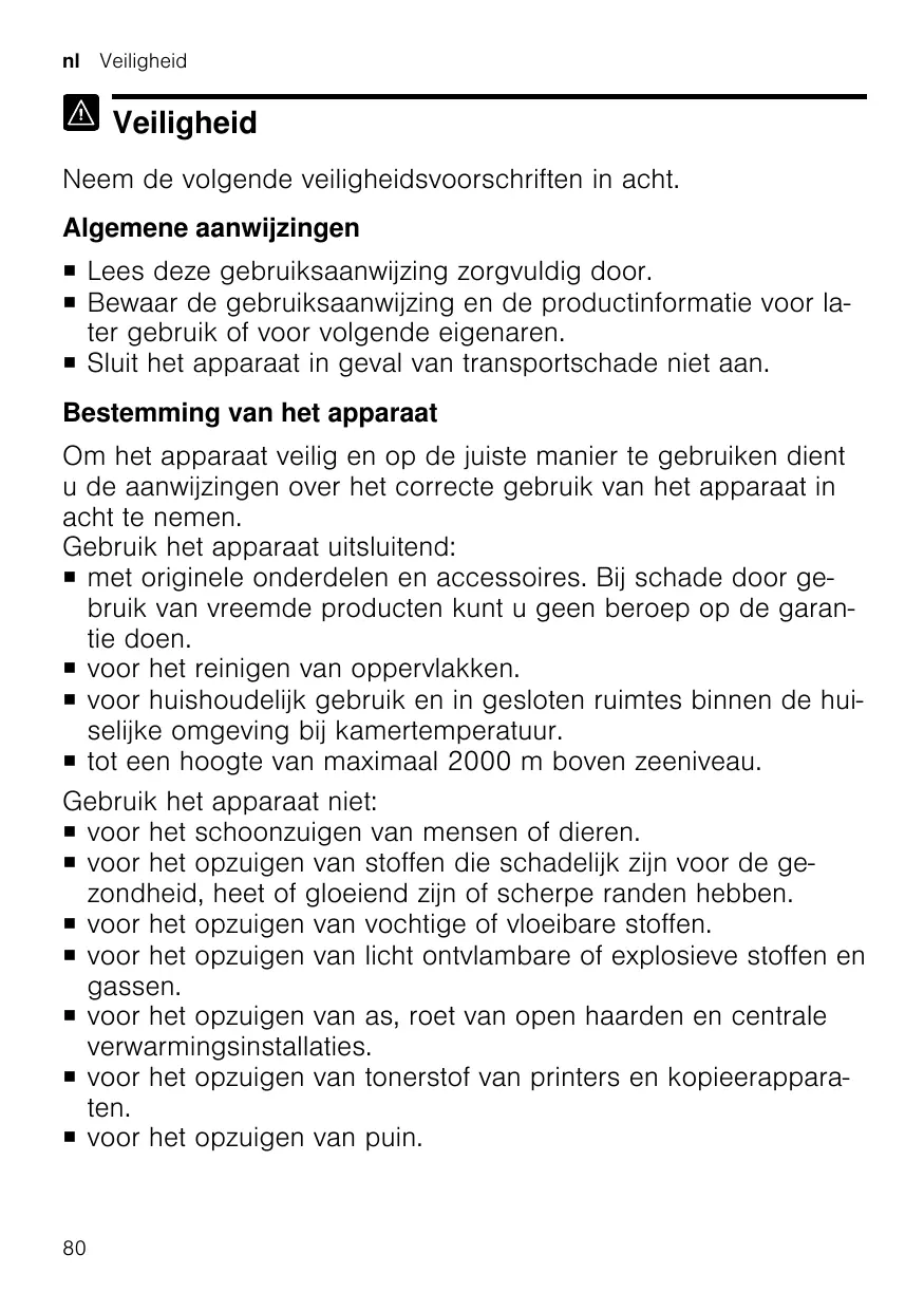 nl Veiligheid Veiligheid Neem de volgende veiligheidsvoorschriften in acht. Algemene aanwijzingen ¡ Lees deze gebruiksaanwijzing zorgvuldig door. ¡ Bewaar de gebruiksaanwijzing en de productinformatie voor later gebruik of voor volgende eigenaren. ¡ Sluit het apparaat in geval van transportschade niet aan. Bestemming van het apparaat Om het apparaat veilig en op de juiste manier te gebruiken dient u de aanwijzingen over het correcte gebruik van het apparaat in acht te nemen. Gebruik het apparaat uitsluitend: ¡ met originele onderdelen en accessoires. Bij schade door gebruik van vreemde producten kunt u geen beroep op de garantie doen. ¡ voor het reinigen van oppervlakken. ¡ voor huishoudelijk gebruik en in gesloten ruimtes binnen de huiselijke omgeving bij kamertemperatuur. ¡ tot een hoogte van maximaal 2000 m boven zeeniveau. Gebruik het apparaat niet: ¡ voor het schoonzuigen van mensen of dieren. ¡ voor het opzuigen van stoffen die schadelijk zijn voor de gezondheid, heet of gloeiend zijn of scherpe randen hebben. ¡ voor het opzuigen van vochtige of vloeibare stoffen. ¡ voor het opzuigen van licht ontvlambare of explosieve stoffen en gassen. ¡ voor het opzuigen van as, roet van open haarden en centrale verwarmingsinstallaties. ¡ voor het opzuigen van tonerstof van printers en kopieerapparaten. ¡ voor het opzuigen van puin.