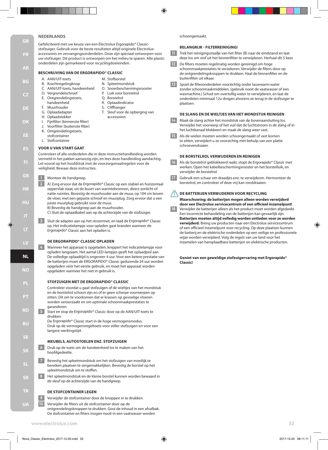 GB FR AR BG CZ DE DK EE ES FI GR HR NEDERLANDS Gefeliciteerd met uw keuze van een Electrolux Ergorapido® Classicstofzuiger. Gebruik voor de beste resultaten altijd originele Electroluxaccessoires en vervangingsonderdelen. Deze zijn speciaal ontworpen voor uw stofzuiger. Dit product is ontworpen om het milieu te sparen. Alle plastic onderdelen zijn gemarkeerd voor recyclingdoeleinden.