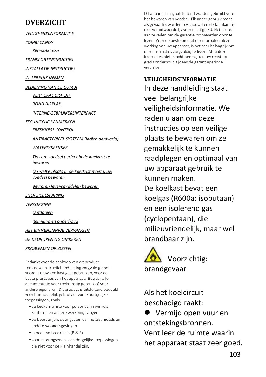 In deze handleiding staat veel belangrijke veiligheidsinformatie. We raden u aan om deze instructies op een veilige plaats te bewaren om ze gemakkelijk te kunnen raadplegen en optimaal van uw apparaat gebruik te kunnen maken. De koelkast bevat een koelgas (R600a: isobutaan) en een isolerend gas (cyclopentaan), die milieuvriendelijk, maar wel brandbaar zijn. Nederlands OVERZICHT VEILIGHEIDSINFORMATIE COMBI CANDY Klimaatklasse TRANSPORTINSTRUCTIES VERTICAAL DISPLAY ROND DISPLAY INTERNE GEBRUIKERSINTERFACE TECHNISCHE KENMERKEN FRESHNESS CONTROL ANTIBACTERIEEL SYSTEEM (indien aanwezig) WATERDISPENSER Tips om voedsel perfect in de koelkast te bewaren Op welke plaats in de koelkast moet u uw voedsel bewaren Bevroren levensmiddelen bewaren ENERGIEBESPARING VERZORGING Ontdooien Reiniging en onderhoud