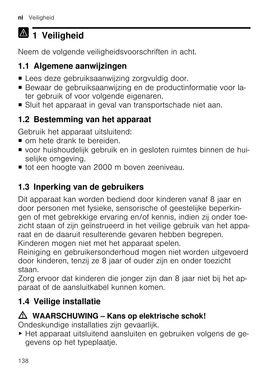 Raadpleeg de Digitale Gebruikersgids voor meer informatie. Inhoudsopgave 1 Veiligheid 138 1.1 Algemene aanwijzingen 138 1.2 Bestemming van het apparaat 138 1.3 Inperking van de gebruikers .. 138 1.4 Veilige installatie 138 1.5 Veilig gebruik 139 2 Materiële schade voorkomen .. 143 3 Milieubescherming en besparing 143 3.1 Afvoeren van de verpakking .. 143 3.2 Energie besparen 143 4 Opstellen en aansluiten 143 4.1 Leveringsomvang 143 4.2 Apparaat inbouwen en aansluiten 144 4.3 Apparaat elektrisch aansluiten 144 5 Uw apparaat leren kennen 144 5.1 Apparaat 144 5.2 Bedieningspaneel 145 6 Accessoires 146 7 Voor het eerste gebruik 146 7.1 Apparaat voorbereiden en reinigen 146 7.2 Waterhardheid bepalen 146 7.3 Waterfilter1 147 7.4 Eerste keer in gebruik nemen 147 7.5 Algemene aanwijzingen 148