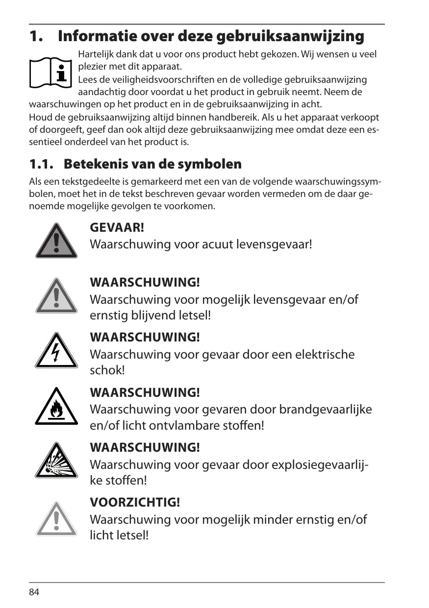 Hartelijk dank dat u voor ons product hebt gekozen. Wij wensen u veel plezier met dit apparaat. Lees de veiligheidsvoorschriften en de volledige gebruiksaanwijzing aandachtig door voordat u het product in gebruik neemt. Neem de waarschuwingen op het product en in de gebruiksaanwijzing in acht. Houd de gebruiksaanwijzing altijd binnen handbereik. Als u het apparaat verkoopt of doorgeeft, geef dan ook altijd deze gebruiksaanwijzing mee omdat deze een essentieel onderdeel van het product is. 1.1. Betekenis van de symbolen Als een tekstgedeelte is gemarkeerd met een van de volgende waarschuwingssymbolen, moet het in de tekst beschreven gevaar worden vermeden om de daar genoemde mogelijke gevolgen te voorkomen. GEVAAR! Waarschuwing voor acuut levensgevaar! WAARSCHUWING! Waarschuwing voor mogelijk levensgevaar en/of ernstig blijvend letsel! WAARSCHUWING! Waarschuwing voor gevaar door een elektrische schok! WAARSCHUWING! Waarschuwing voor gevaren door brandgevaarlijke en/of licht ontvlambare stoffen! WAARSCHUWING! Waarschuwing voor gevaar door explosiegevaarlijke stoffen! VOORZICHTIG! Waarschuwing voor mogelijk minder ernstig en/of licht letsel!