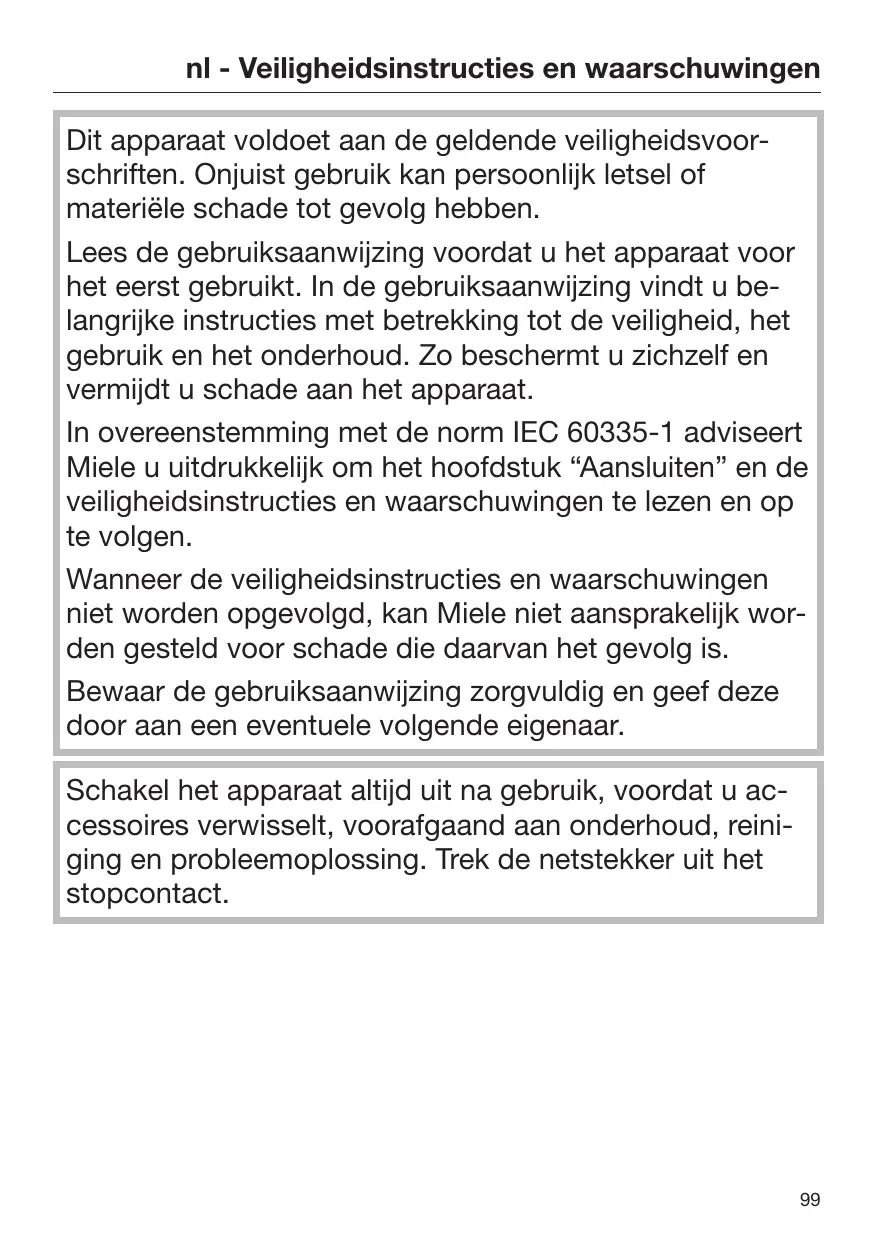 nl - Veiligheidsinstructies en waarschuwingen Dit apparaat voldoet aan de geldende veiligheidsvoorschriften. Onjuist gebruik kan persoonlijk letsel of materiële schade tot gevolg hebben. Lees de gebruiksaanwijzing voordat u het apparaat voor het eerst gebruikt. In de gebruiksaanwijzing vindt u belangrijke instructies met betrekking tot de veiligheid, het gebruik en het onderhoud. Zo beschermt u zichzelf en vermijdt u schade aan het apparaat. In overeenstemming met de norm IEC 60335-1 adviseert Miele u uitdrukkelijk om het hoofdstuk “Aansluiten” en de veiligheidsinstructies en waarschuwingen te lezen en op te volgen. Wanneer de veiligheidsinstructies en waarschuwingen niet worden opgevolgd, kan Miele niet aansprakelijk worden gesteld voor schade die daarvan het gevolg is. Bewaar de gebruiksaanwijzing zorgvuldig en geef deze door aan een eventuele volgende eigenaar. Schakel het apparaat altijd uit na gebruik, voordat u accessoires verwisselt, voorafgaand aan onderhoud, reiniging en probleemoplossing. Trek de netstekker uit het stopcontact.