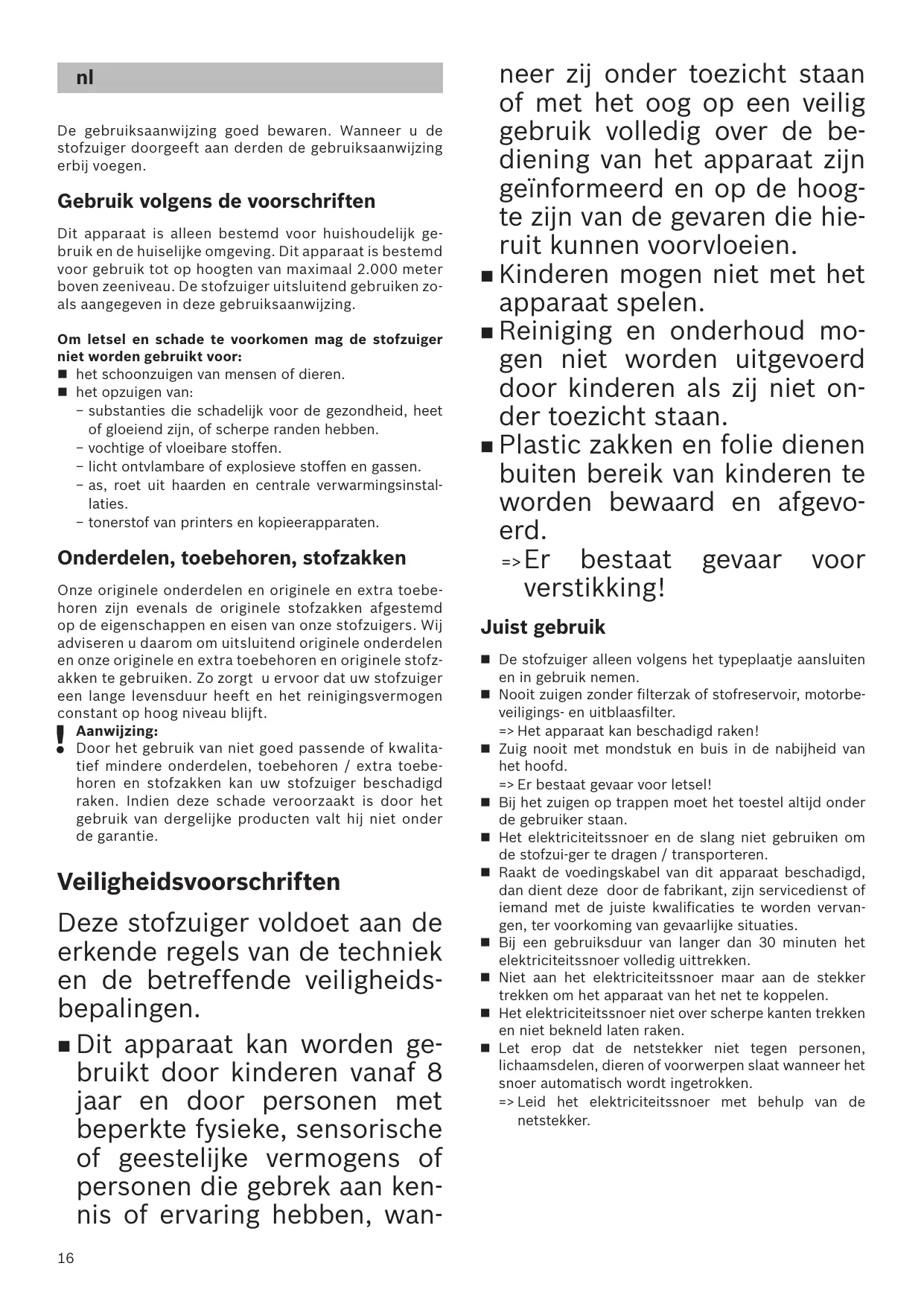 Deze stofzuiger voldoet aan de erkende regels van de techniek en de betreffende veiligheidsbepalingen. Dit apparaat kan worden gebruikt door kinderen vanaf 8 jaar en door personen met beperkte fysieke, sensorische of geestelijke vermogens of personen die gebrek aan kennis of ervaring hebben, wan16