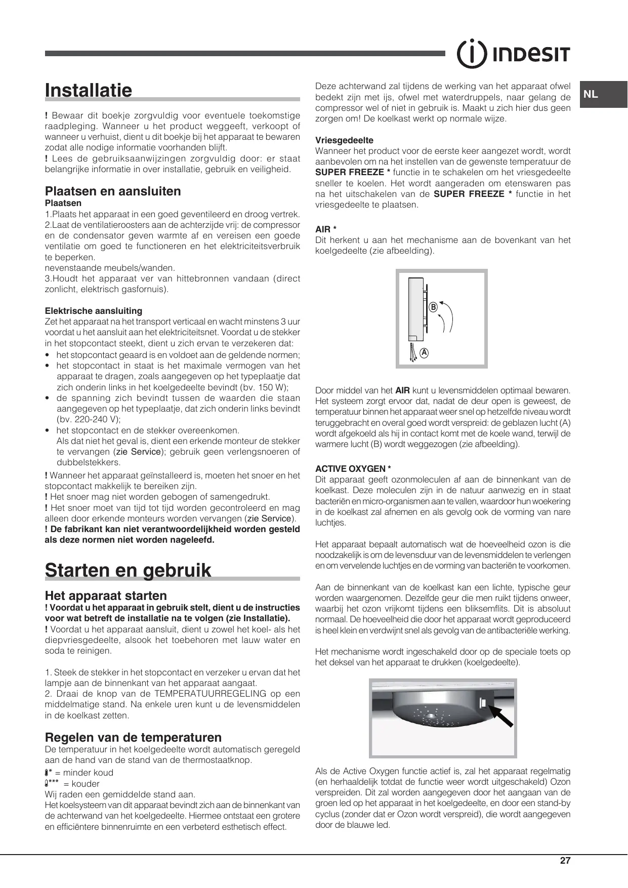 ! Es ist äußerst wichtig, diese Bedienungsanleitung sorgfältig aufzubewahren, um sie jederzeit zu Rate ziehen zu können. • De koelkast of de diepvrieskast zijn overmatig gevuld. • De temperatuur van het vertrek waar het apparaat zich bevindt is lager dan 14°C. In de koelkast bevriezen de etenswaren. • De knop van de TEMPERATUURREGELING staat niet op de goede stand • De levensmiddelen staan in contact met de achterwand. De ventilator AIR draait niet. • De deur van de koelkast staat open • Het AIR systeem wordt alleen dan automatisch geactiveerd als het noodzakelijk is de optimale condities aan de binnenkant van het koelgedeelte terug te brengen. De motor blijft doorlopend draaien • De deur is niet goed dicht of wordt constant geopend. • De buitentemperatuur is erg hoog. • De ijslaag is meer dan 2-3 mm dik (zie Onderhoud). Het apparaat maakt veel lawaai. • la tensión de alimentación esté comprendida entre los valores indicados en la placa de características ubicada abajo a la izquierda (ej. 220-240V); • la toma sea compatible con el enchufe del aparato. Si no fuera así, solicite la sustitución del enchufe a un técnico autorizado (ver Asistencia); no utilice prolongaciones ni conexiones múltiples. ! Una vez instalado el aparato, el cable eléctrico y la toma de corriente deben ser fácilmente accesibles. ! El cable no debe sufrir pliegues ni compresiones. Regulación de la temperatura