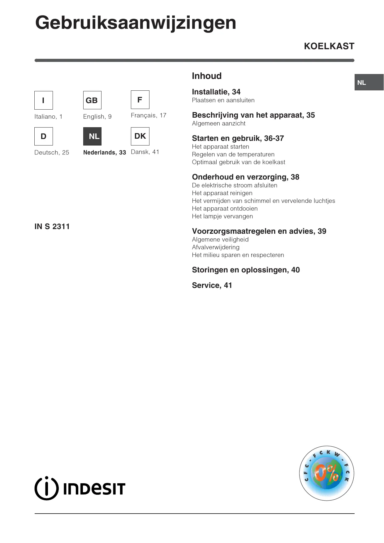 Download de handleiding voor uw Koelkast in PDF-formaat gratis! Vind uw handleiding IN S 2312 F077264 - INDESIT en neem uw elektronisch apparaat weer in handen. Op deze pagina staan alle documenten die nodig zijn voor het gebruik van uw apparaat. IN S 2312 F077264 van het merk INDESIT.