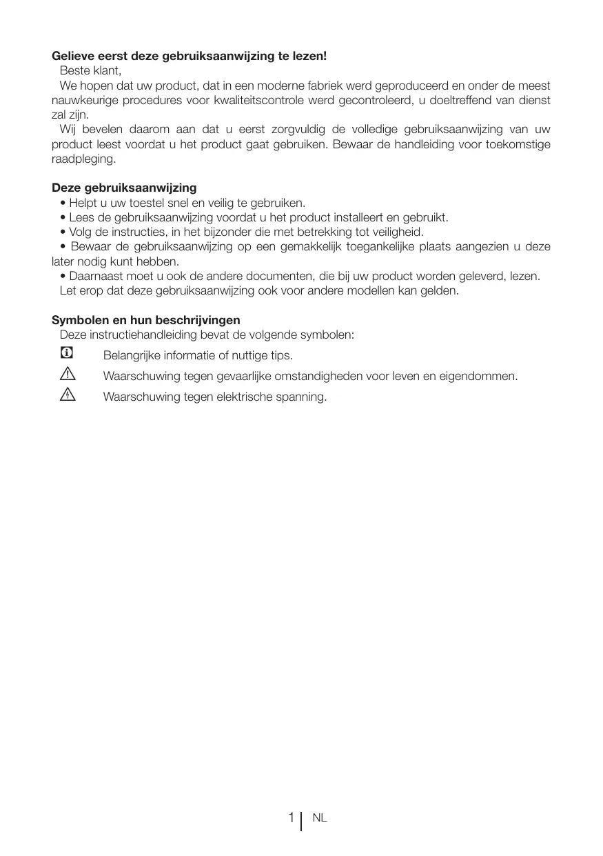 FR Gelieve eerst deze gebruiksaanwijzing te lezen! Beste klant, We hopen dat uw product, dat in een moderne fabriek werd geproduceerd en onder de meest nauwkeurige procedures voor kwaliteitscontrole werd gecontroleerd, u doeltreffend van dienst zal zijn. Wij bevelen daarom aan dat u eerst zorgvuldig de volledige gebruiksaanwijzing van uw product leest voordat u het product gaat gebruiken. Bewaar de handleiding voor toekomstige raadpleging. Deze gebruiksaanwijzing • Helpt u uw toestel snel en veilig te gebruiken. • Lees de gebruiksaanwijzing voordat u het product installeert en gebruikt. • Volg de instructies, in het bijzonder die met betrekking tot veiligheid. • Bewaar de gebruiksaanwijzing op een gemakkelijk toegankelijke plaats aangezien u deze later nodig kunt hebben. • Daarnaast moet u ook de andere documenten, die bij uw product worden geleverd, lezen. Let erop dat deze gebruiksaanwijzing ook voor andere modellen kan gelden. Symbolen en hun beschrijvingen Deze instructiehandleiding bevat de volgende symbolen: