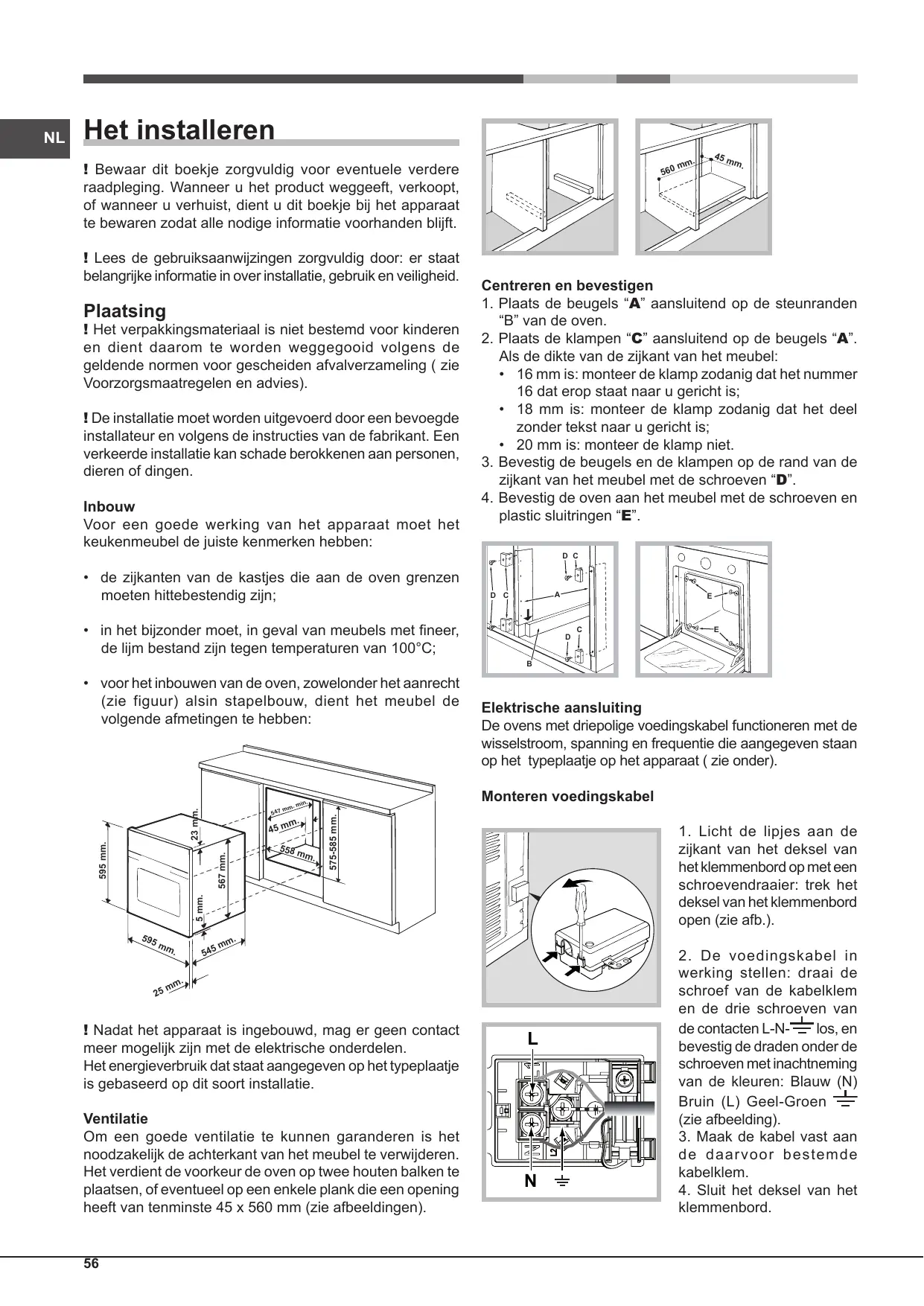 ! Nadat het apparaat is ingebouwd, mag er geen contact meer mogelijk zijn met de elektrische onderdelen. Het energieverbruik dat staat aangegeven op het typeplaatje is gebaseerd op dit soort installatie. Ventilatie Om een goede ventilatie te kunnen garanderen is het noodzakelijk de achterkant van het meubel te verwijderen. Het verdient de voorkeur de oven op twee houten balken te plaatsen, of eventueel op een enkele plank die een opening heeft van tenminste 45 x 560 mm (zie afbeeldingen).